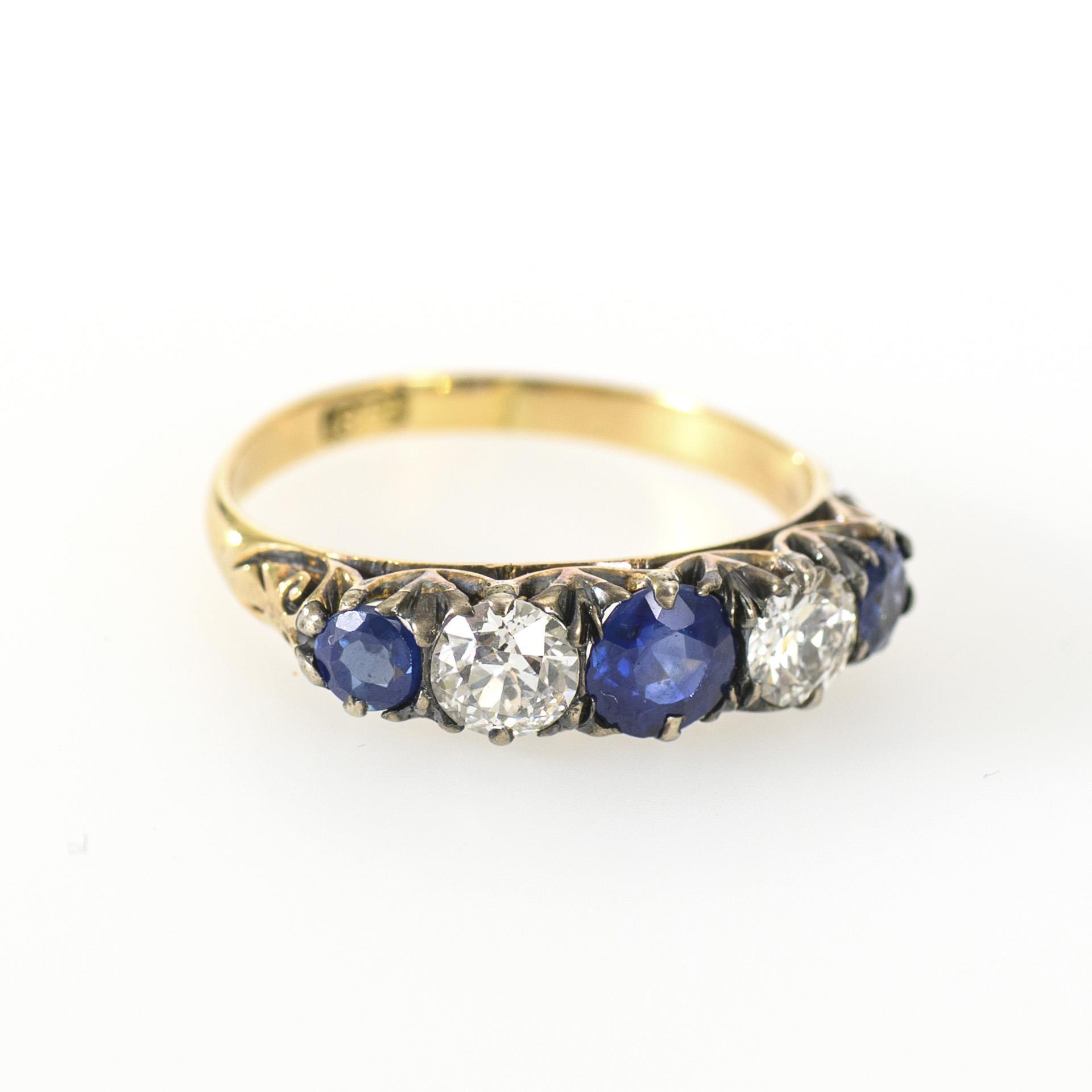 Historischer oder nach historischen Vorlagen und Verarbeitungsmethoden gestalteter Ring mit ungewöhnlichem Besatz aus 3 blauen Farbsteinen, wohl Saphiren, sowie einem Altschliff- und einem modernen Brillanten, in Silber gefasst, an einer Gelbgold-Schiene. Eine minimale Verfärbung an der Ringschiene, der moderne Brillant evtl. spätere Ersetzung.