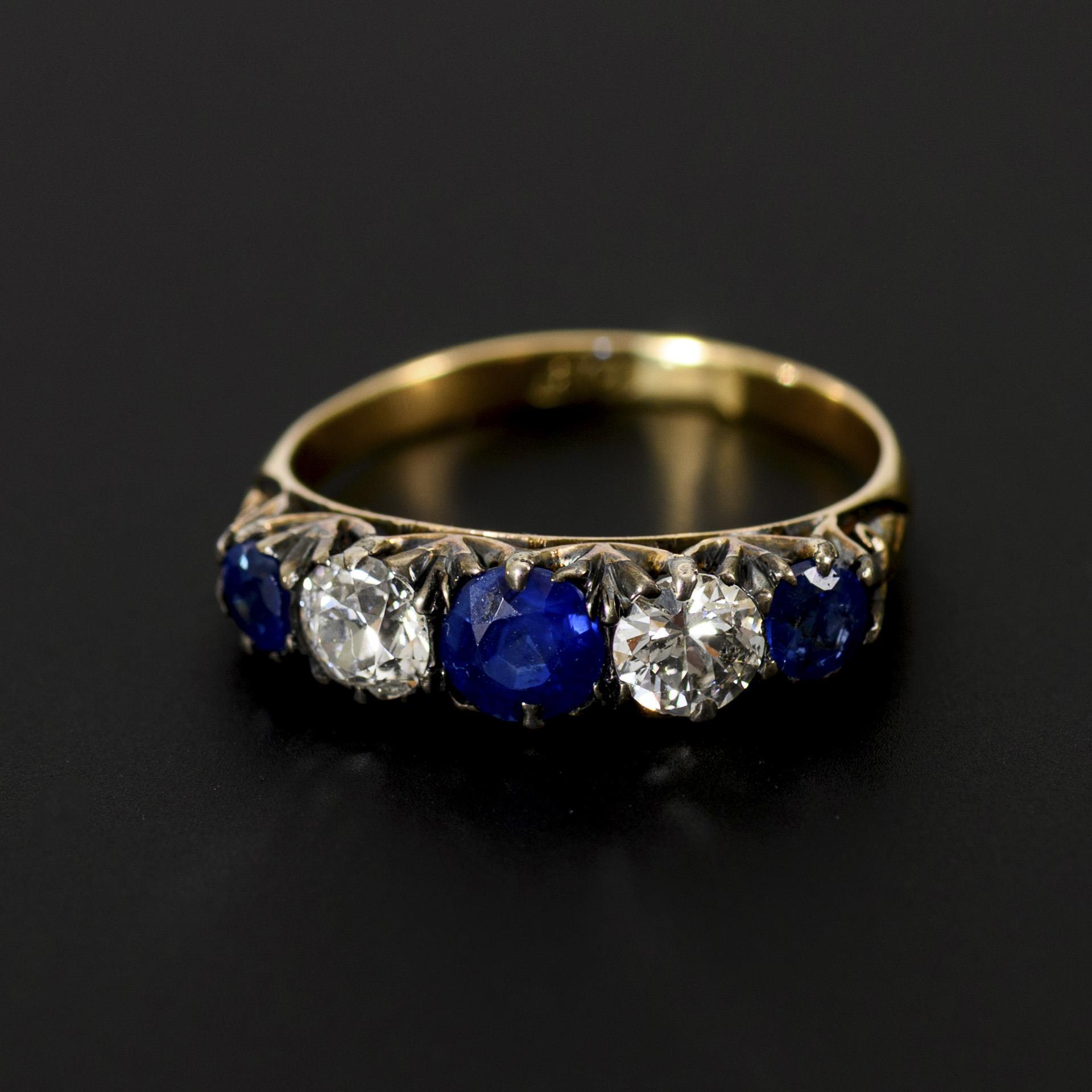 Historischer oder nach historischen Vorlagen und Verarbeitungsmethoden gestalteter Ring mit ungewöhnlichem Besatz aus 3 blauen Farbsteinen, wohl Saphiren, sowie einem Altschliff- und einem modernen Brillanten, in Silber gefasst, an einer Gelbgold-Schiene. Eine minimale Verfärbung an der Ringschiene, der moderne Brillant evtl. spätere Ersetzung.