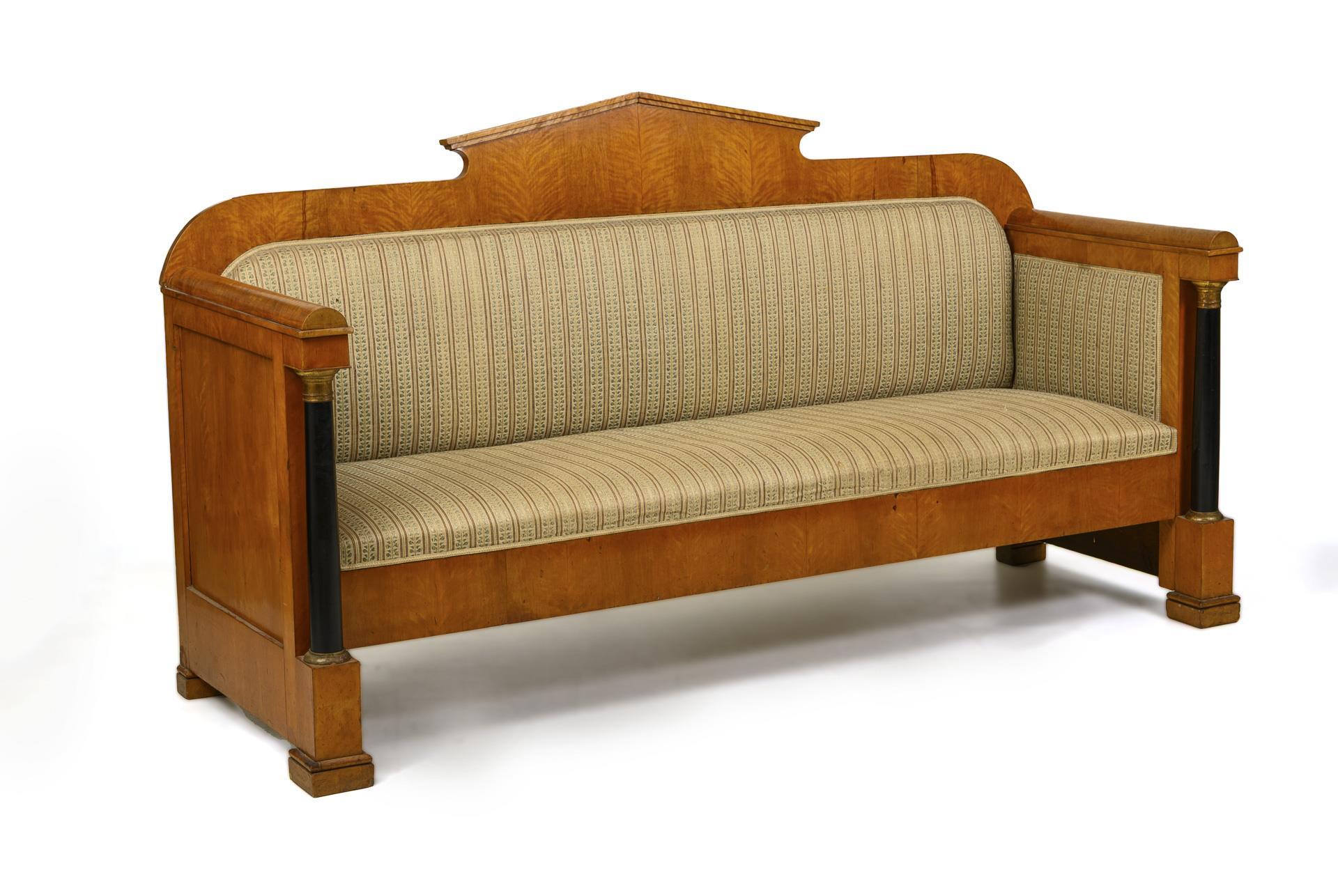Gerader Korpus, Rückenlehne mit breitem Dreiecksgiebel und gerundeten Ecken, flach gepolsterte Seitenwände mit gerundeten Armstützen und frontseitig schwarzen Vollsäulen mit Messing, auf 4 Postamentfüßen. Heller, gestreifter Stoffbezug. Restauriert, mit Ergänzungen, inaktiver Anobienbefall.