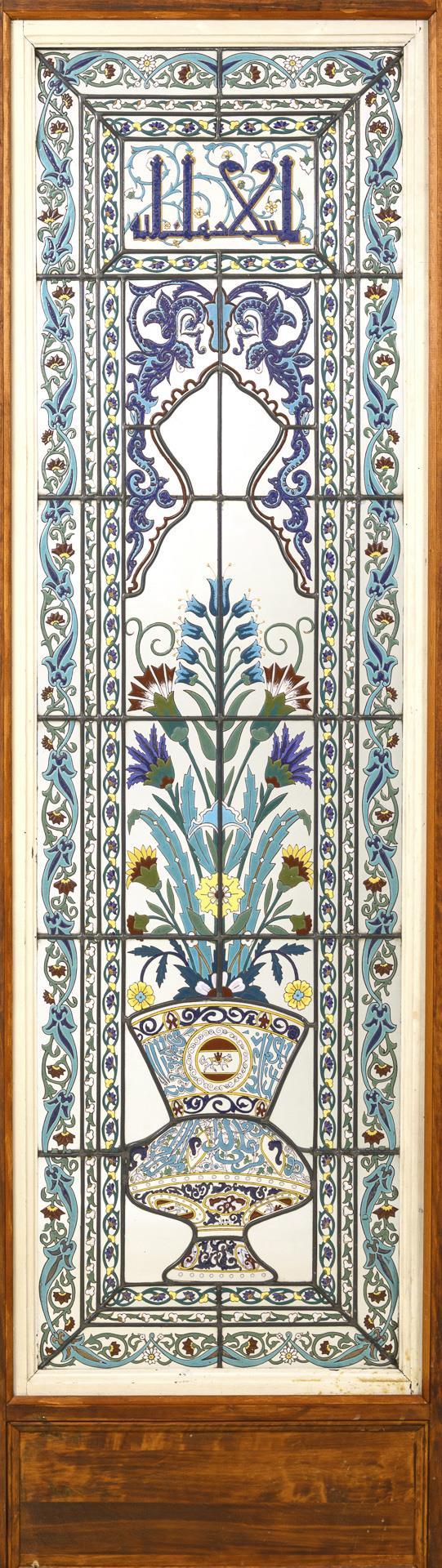 Rechteckiges Fenster mit erhabener Emailmalerei im Stil der türkischen İznik-Keramik: gerahmt von einer Floral- und Ornamentbordüre eine Moscheeampel mit stilisiertem Blumenbukett, als Bekrönung pseudoarabische Schriftzeichen.
