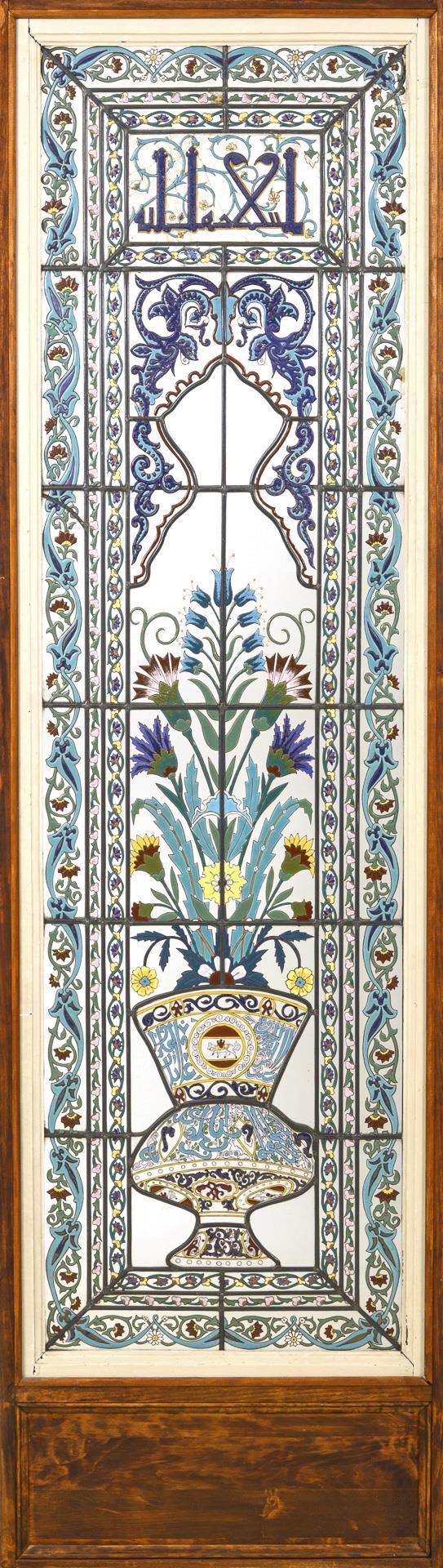 Rechteckiges Fenster mit erhabener Emailmalerei im Stil der türkischen İznik-Keramik: gerahmt von einer Floral- und Ornamentbordüre eine Moscheeampel mit stilisiertem Blumenbukett, als Bekrönung pseudoarabische Schriftzeichen. Partiell geklebte Sprünge und eine Reparatur.