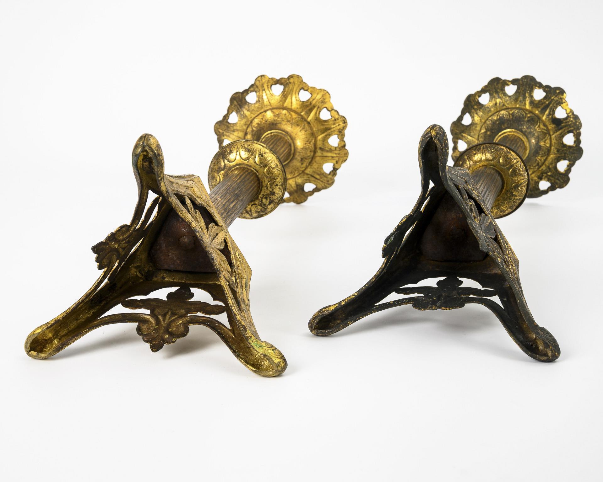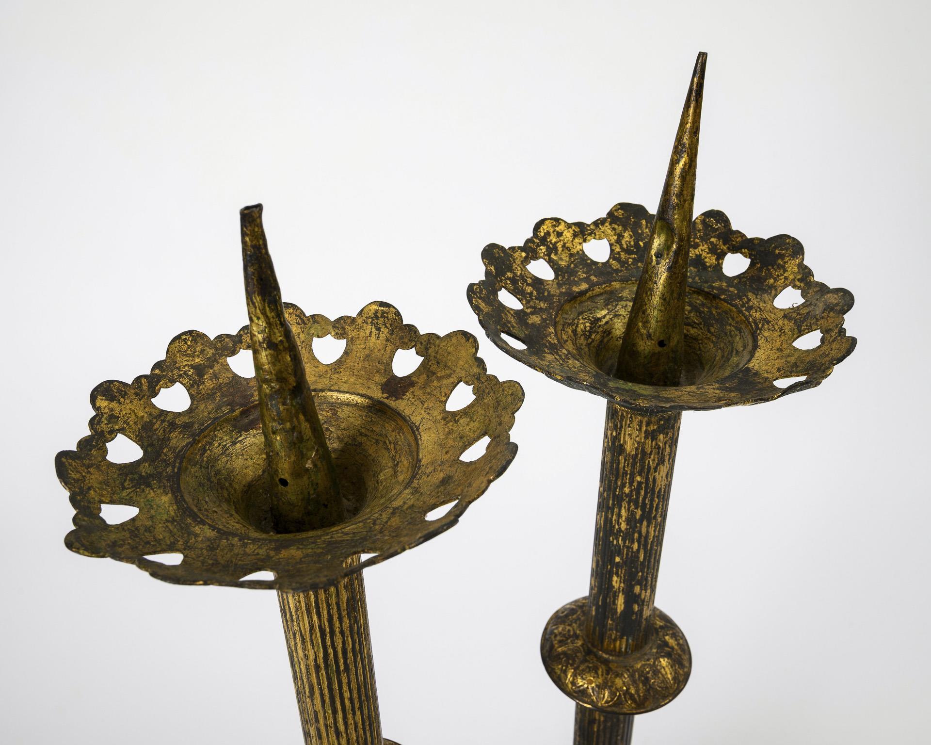 Altarleuchter mit vegetabil reliefiertem, 3-seitigem Sockel, geriffelter Schaft mit Blattzier am Wirtel, blattkelchförmiger Wachsteller mit Messing-Dorn. Fleckige Lackierung, 1 Schaft leicht geknickt, Dorne verbeult.