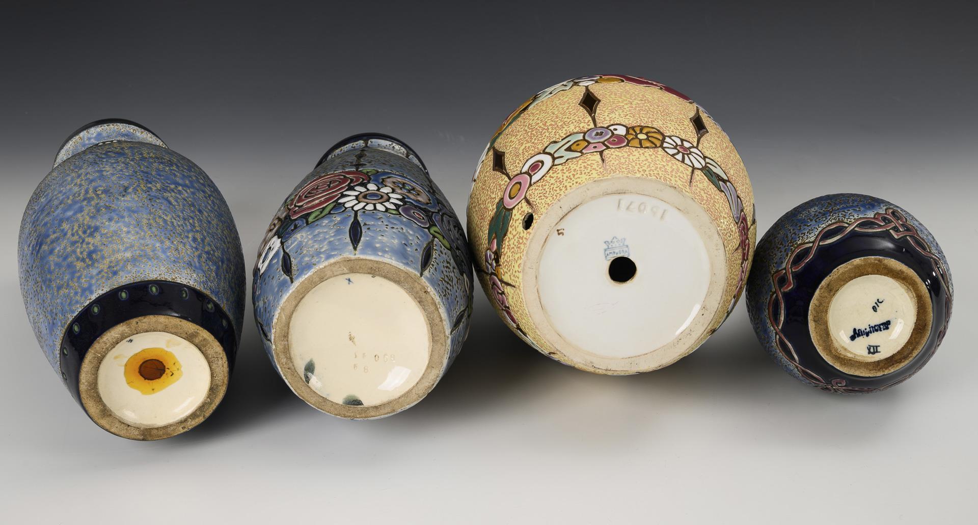3 Vasen und 1 Lampenfuß mit Floraldekor. Amphora, Turn-Teplitz.