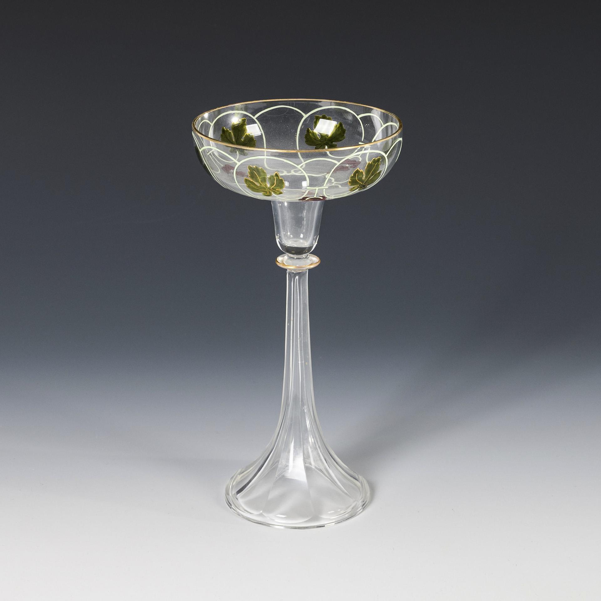 Schalenförmige Kuppa mit trichterförmigem, nach oben offenem Kuppaansatz, Scheibennodus, achtfach facettierter, hoher Trompetenfuß. Auf der Kuppa ein stilisiertes Weinlaub- und -beerendekor.