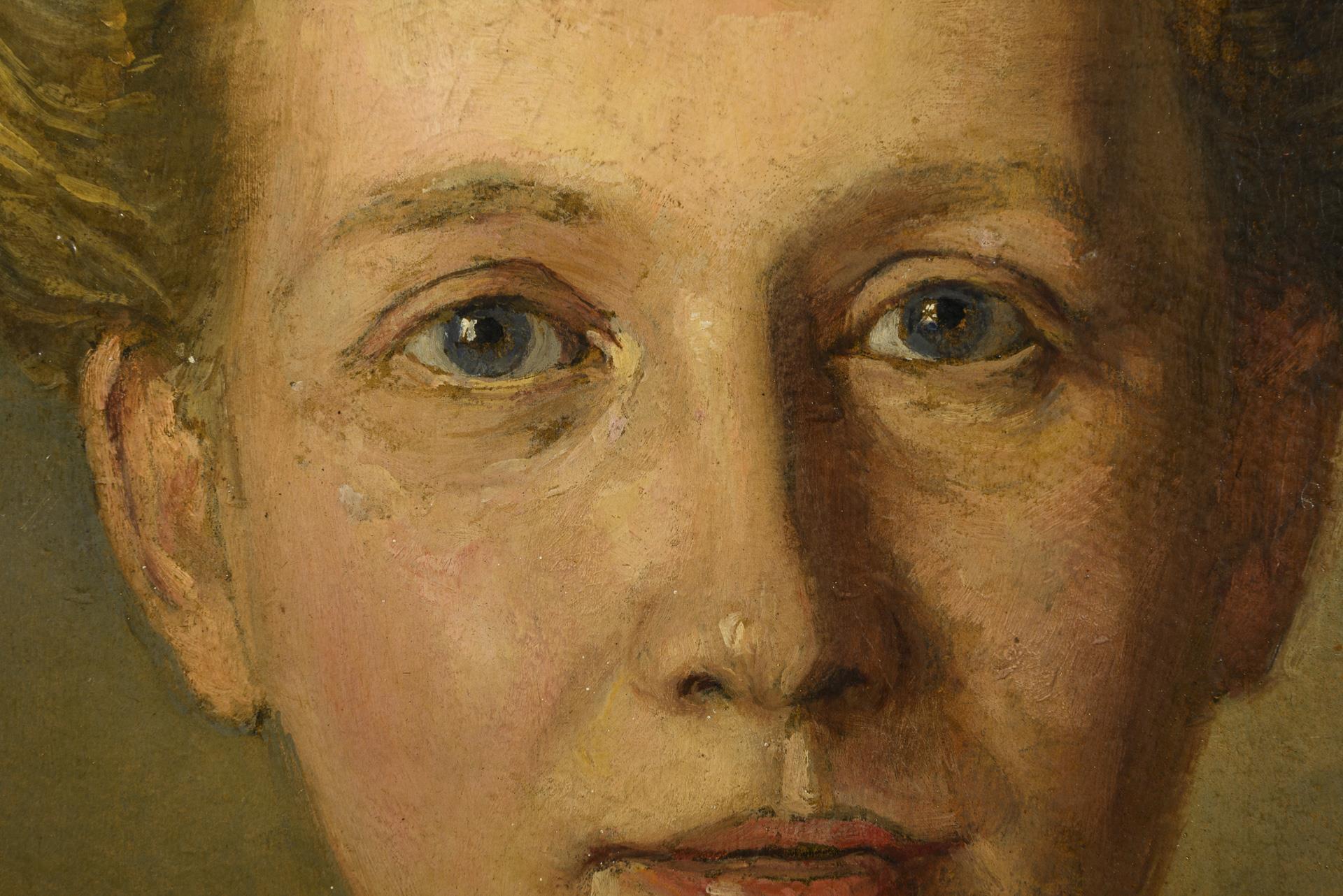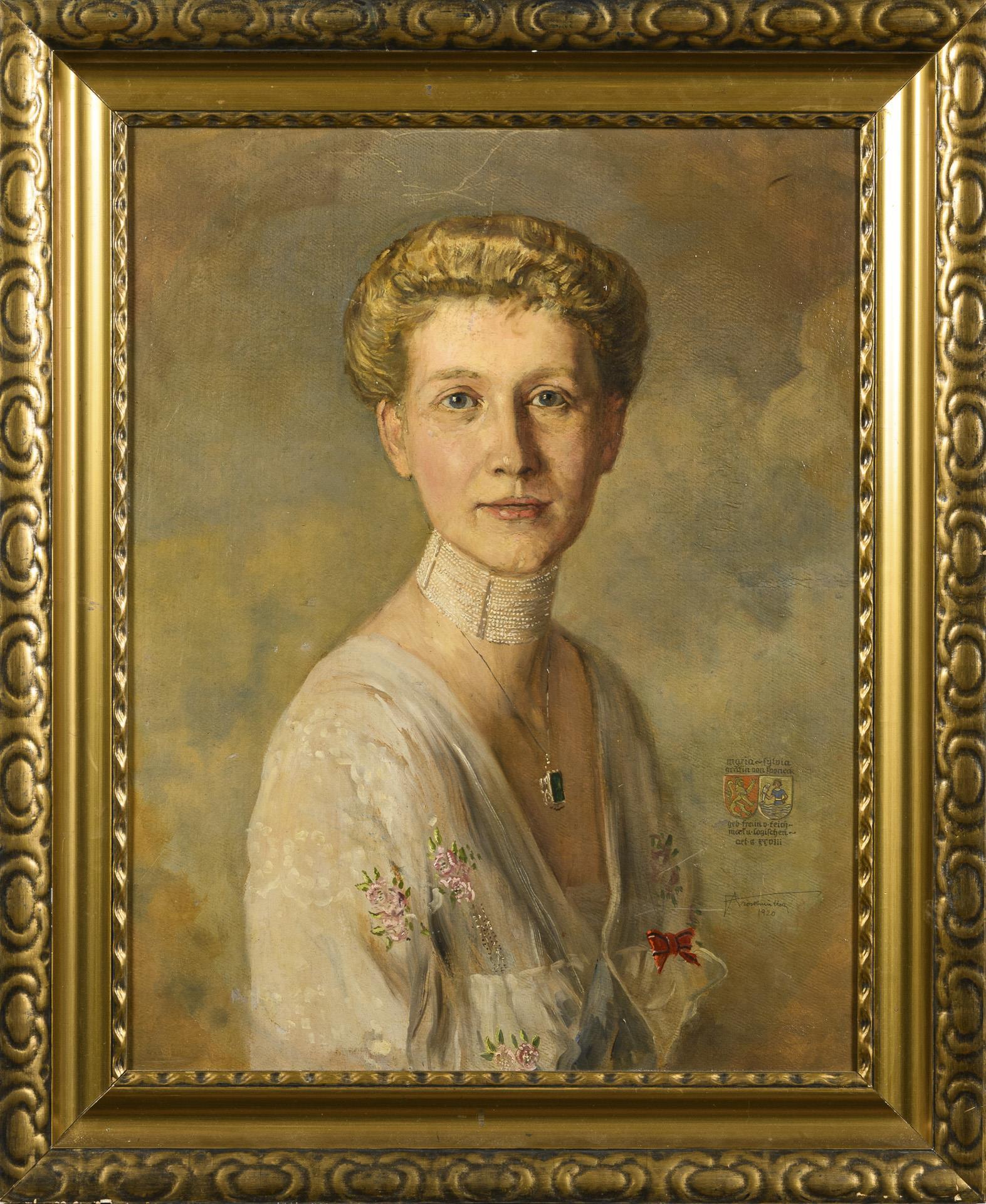 Bildnis der geborenen Freiin von Teichmann und Logischen mit Perlenhalsband und im weißen Oberteil. Kratzer.
