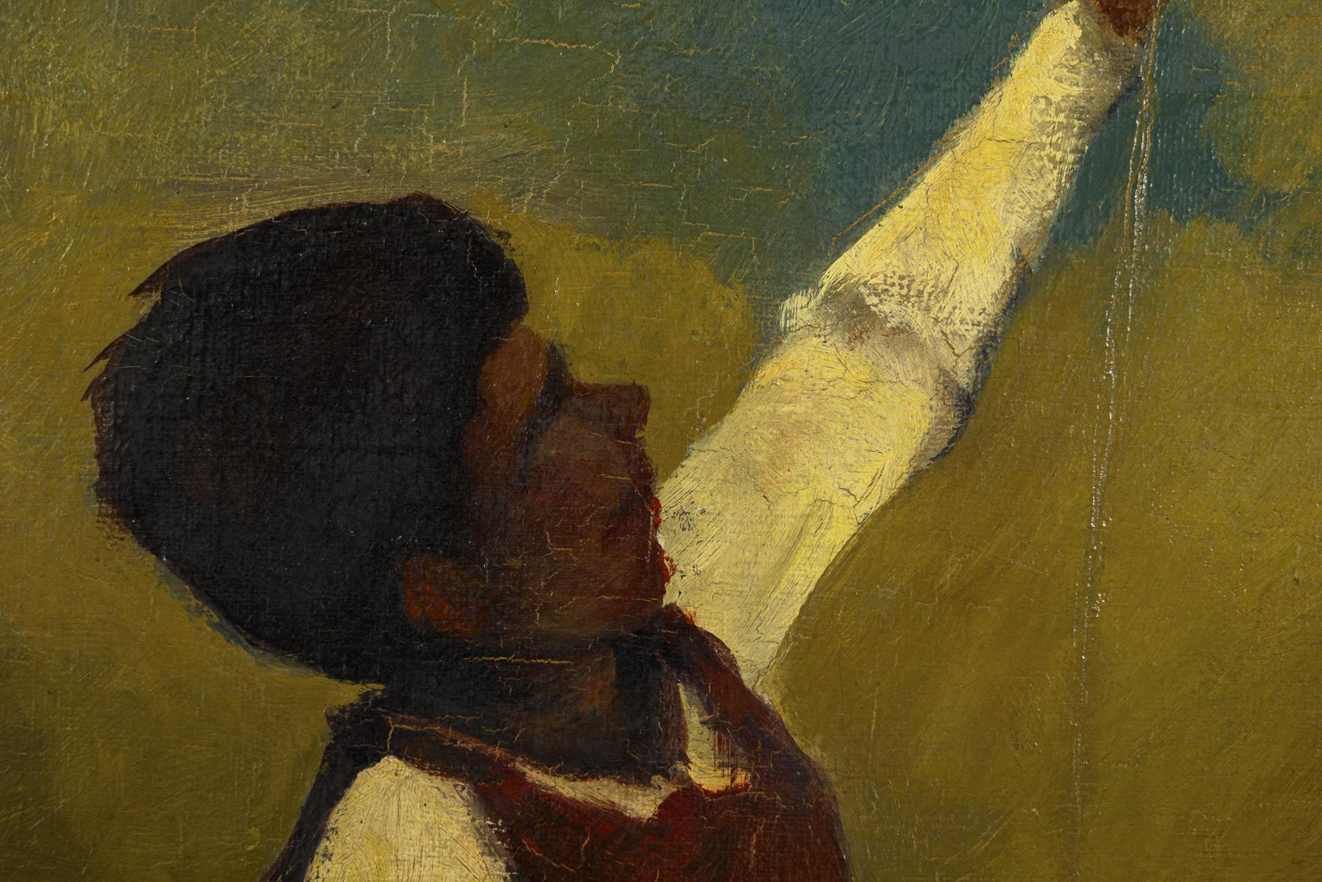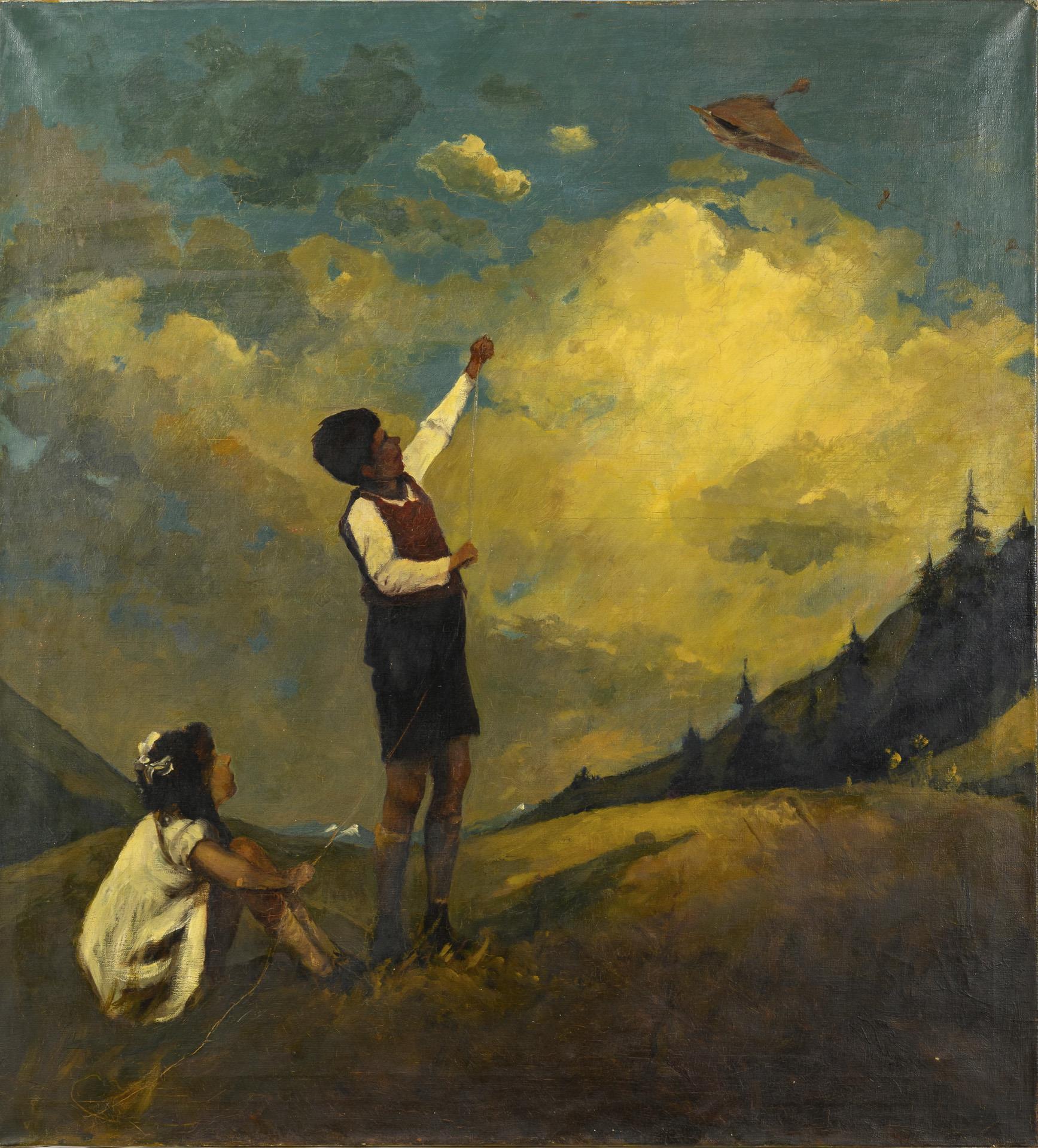 Junge und Mädchen auf dem Wiesenhügel im Sonnenschein mit dem Drachen an der Schnur vor wolkigem Himmel. Leichte Altersspuren.