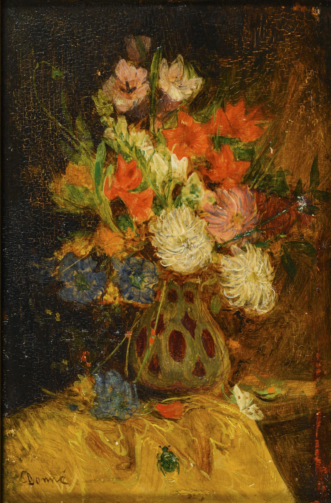 Bunter Blumenstrauß in kleiner Vase. Altersspuren.