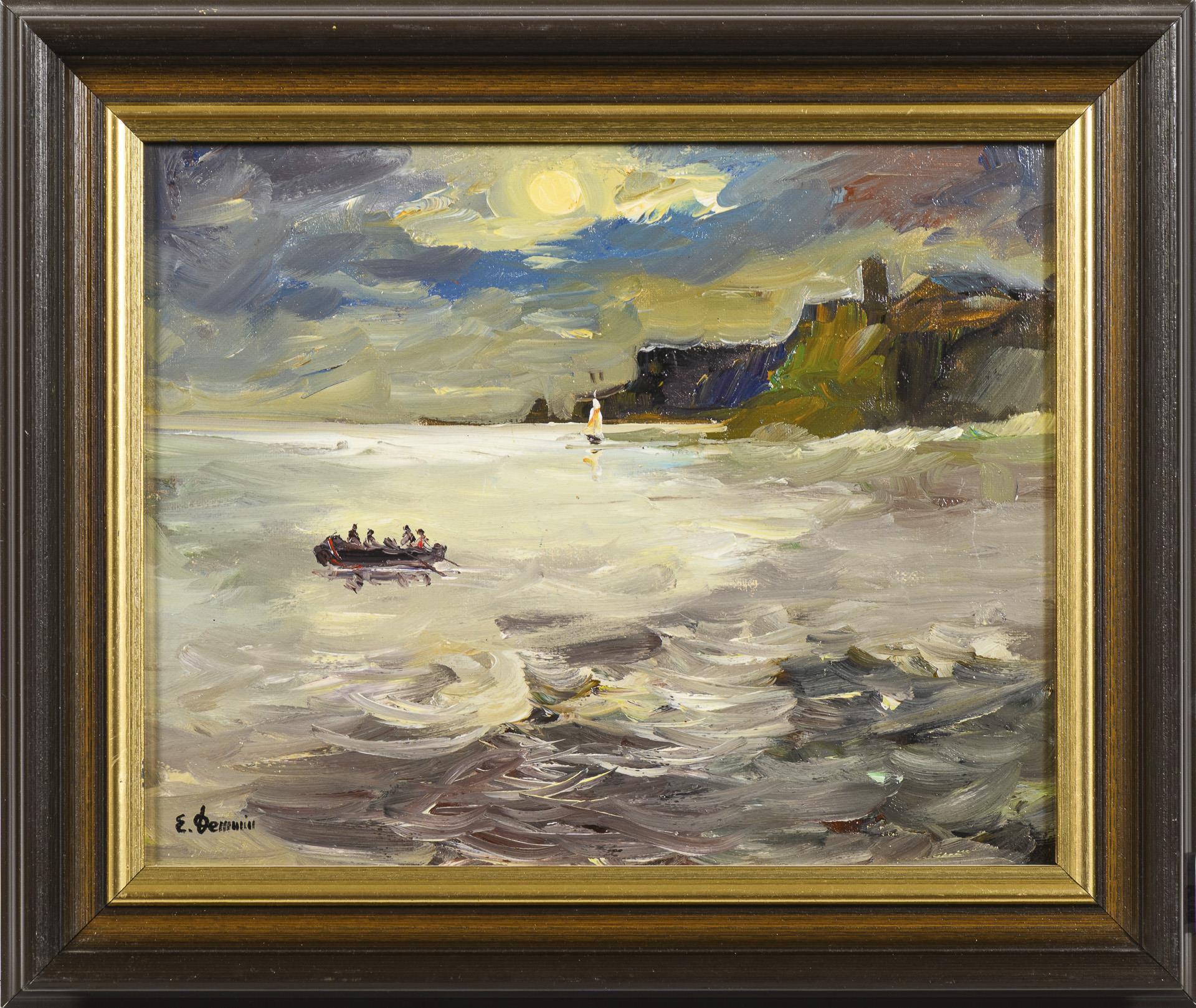 Heller Vollmond über dem Strand und dem ankommenden Ruderboot.