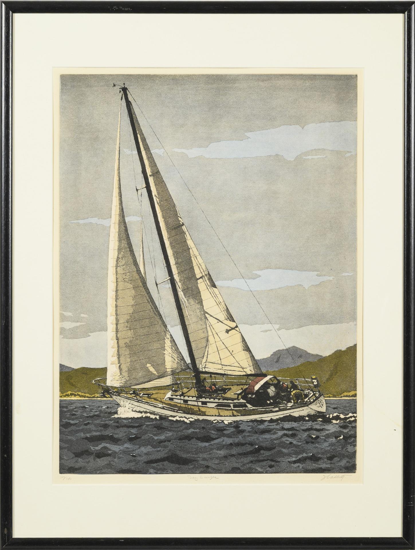 Schnittiges Boot in voller Fahrt, vor bergiger Küste. Nummeriertes Blatt 124/400.