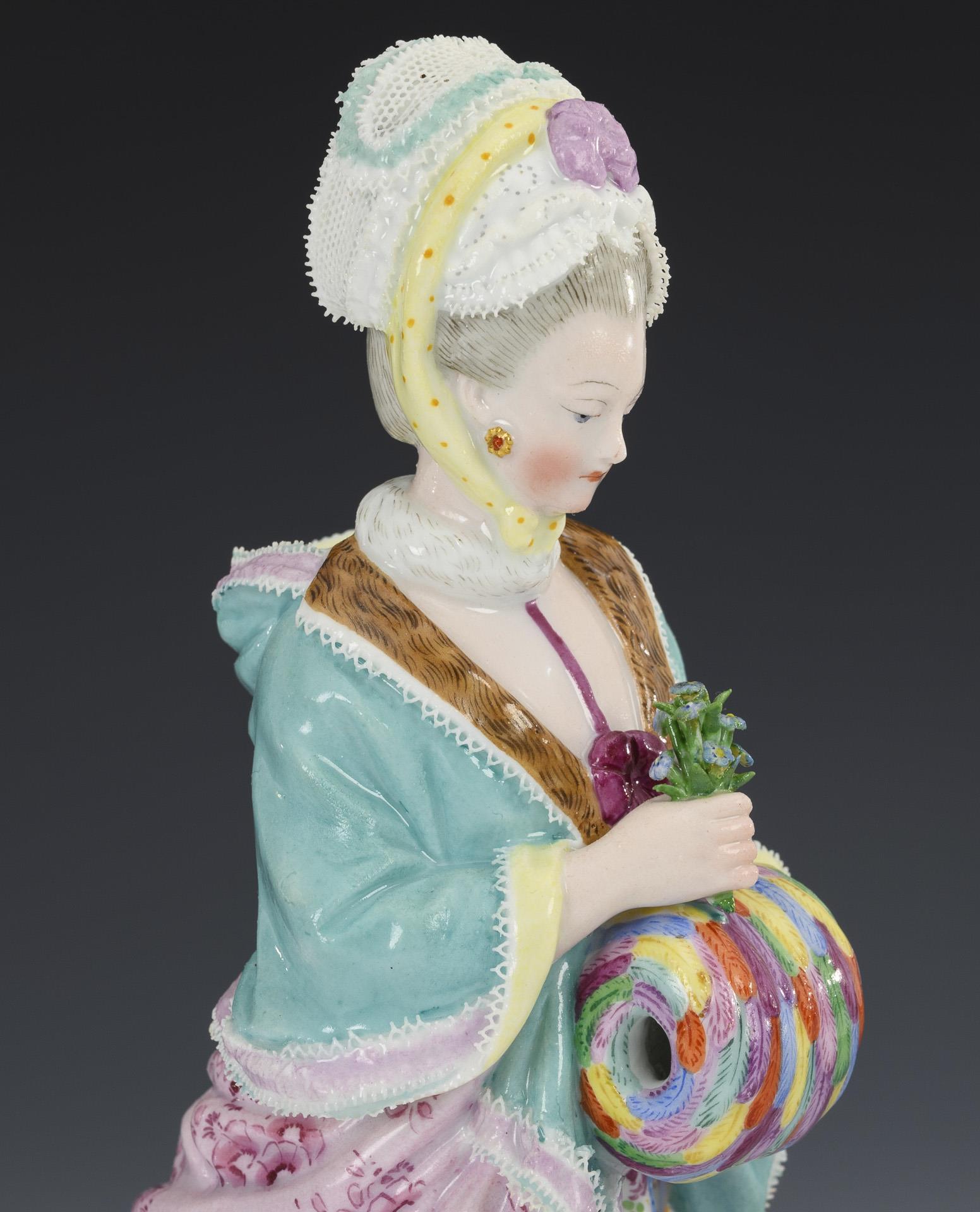 Auf einem Rocaille- und Terrainsockel stehende Dame in winterlicher Kleidung, ein Vergißmeinnichtsträußchen betrachtend. Blumensträußchen minimal restauriert.