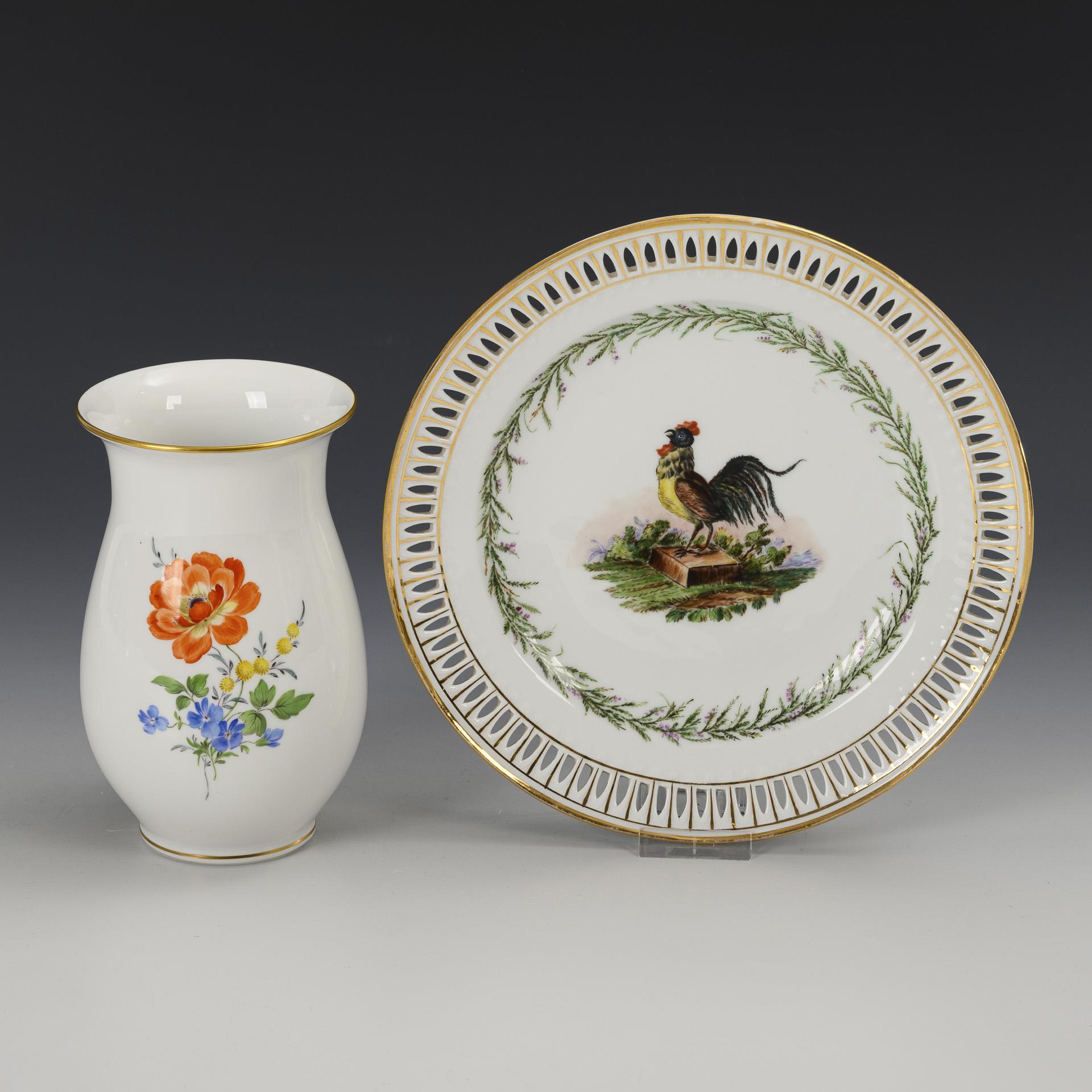 1x KPM BERLIN, 19. Jh., ohne Malereimarke: Dessertteller mit durchbrochenem Rand und der Darstellung eines krähenden Hahnes im Spiegel (Ø 23,5 cm). / 1x MEISSEN, 2. H. 20. Jh.: Balustervase mit Blumenmalerei (H 16,5 cm). Gold des Tellers etwas berieben.