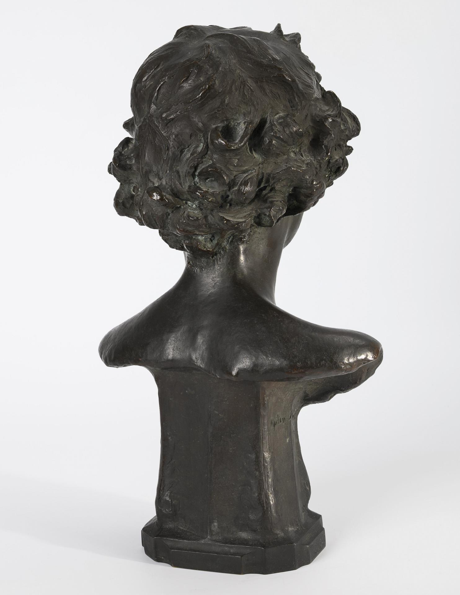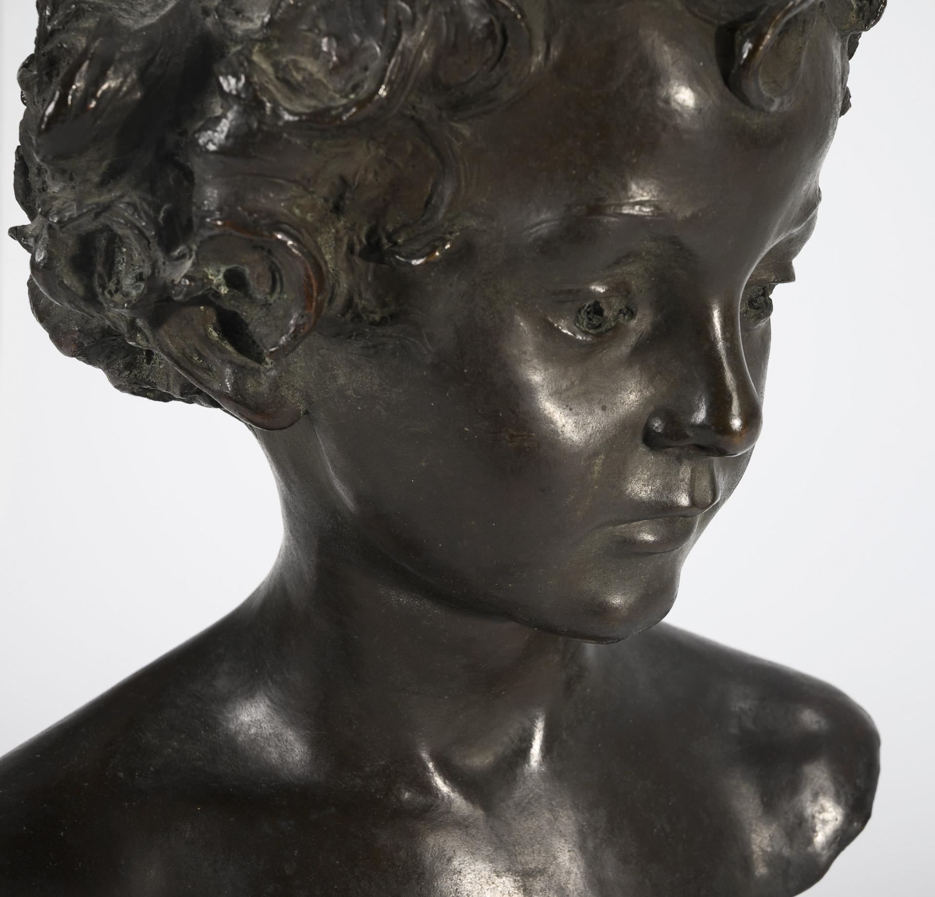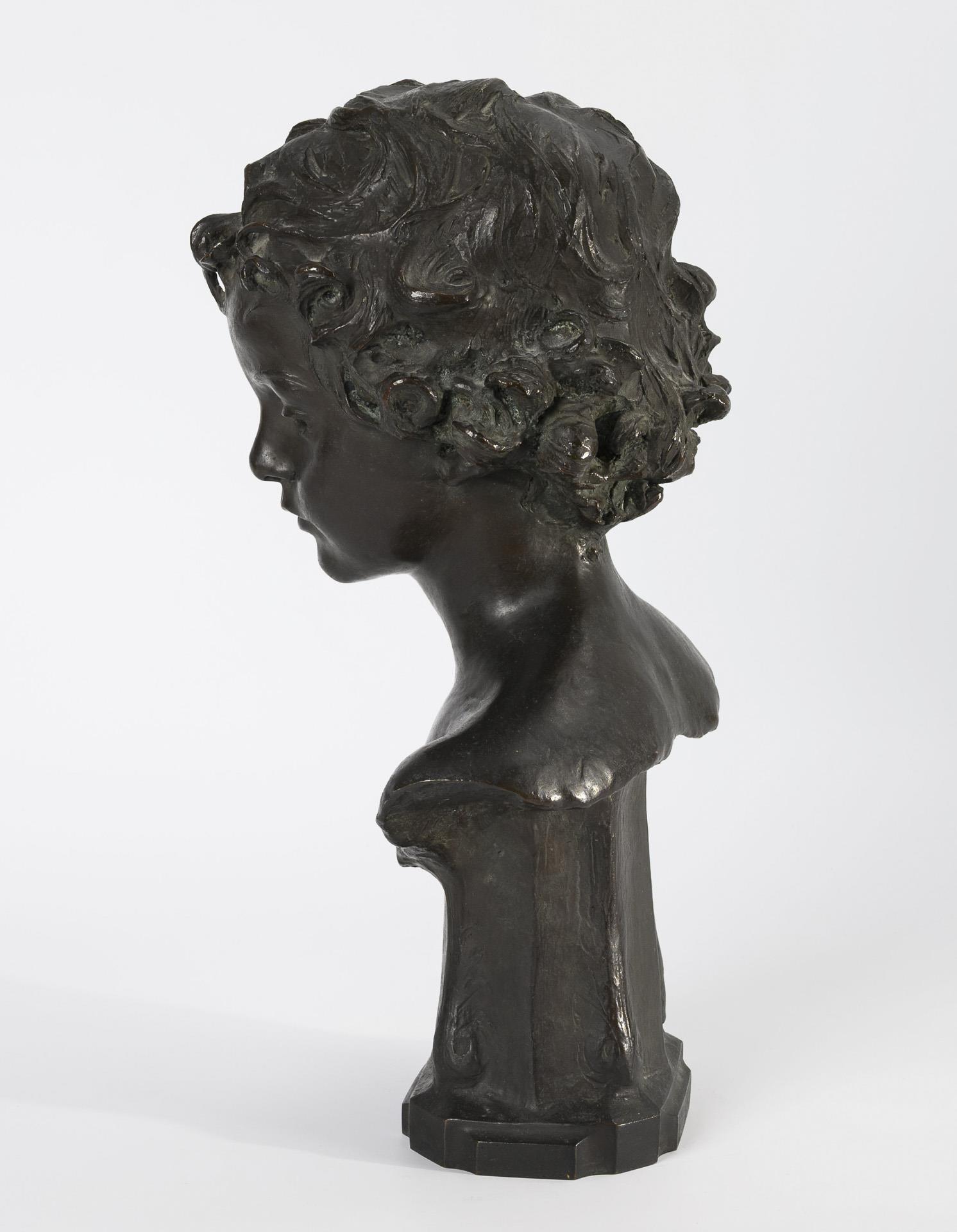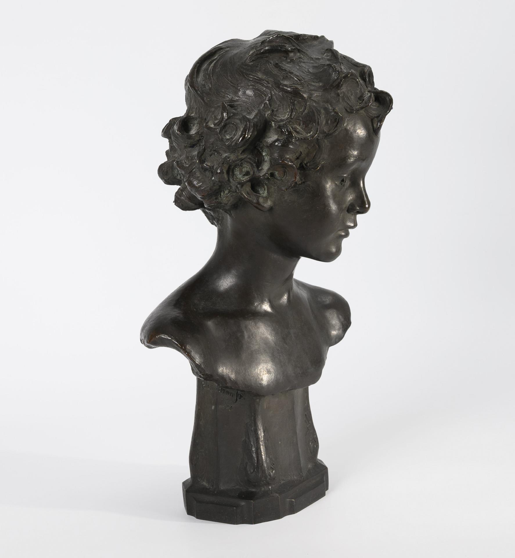 Lebensgroße Büste des versonnen blickenden Knaben mit stark lockigem Haar und leichter Kopfdrehung nach rechts. Beeindruckend ist die psychologische Erfassung des zarten Seelenzustandes.