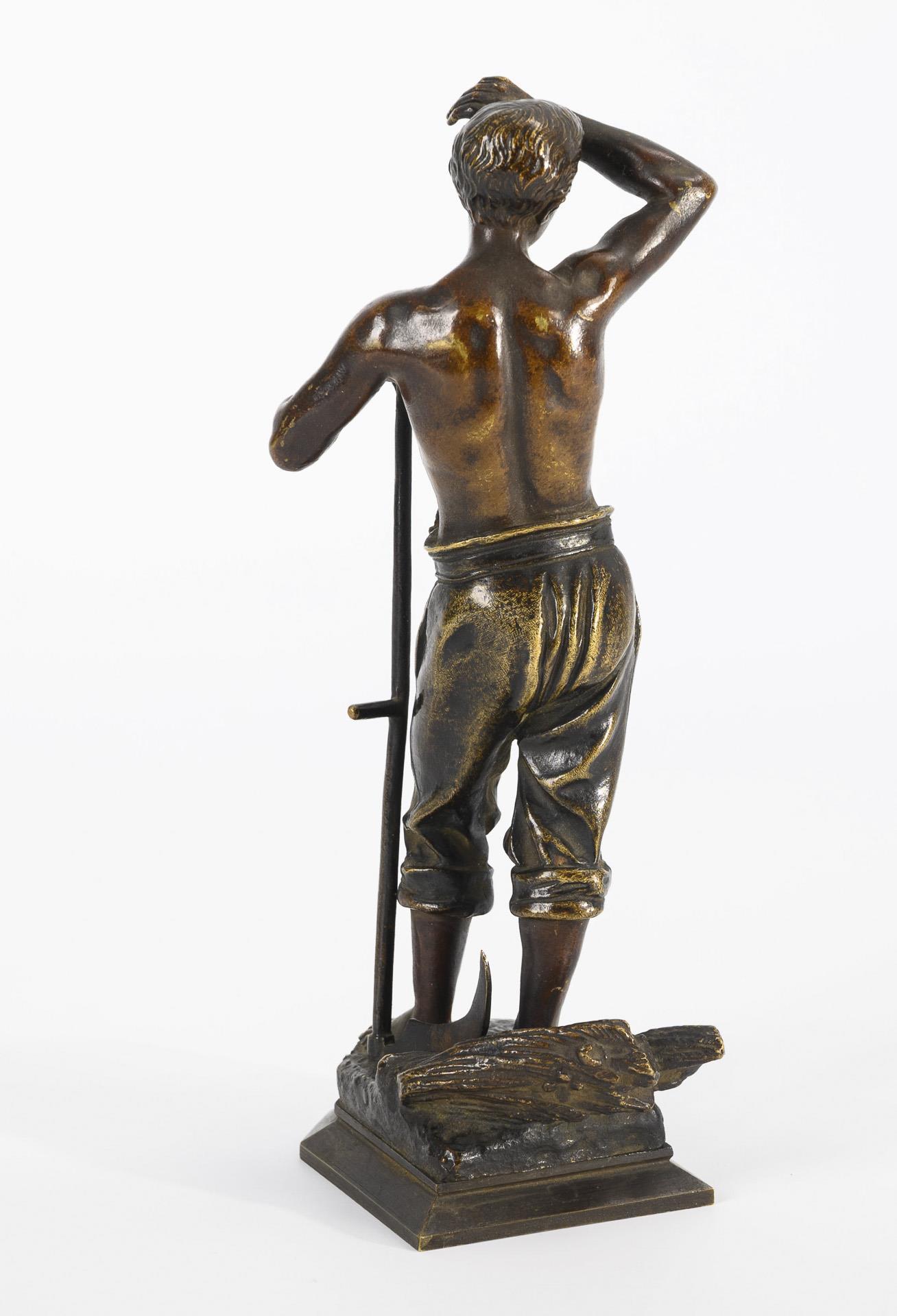 Stehender Bauer mit freiem Oberkörper, der auf die Sense gestützt sich den Schweiß von der Stirn wischt. Patina teils berieben/zerkratzt.