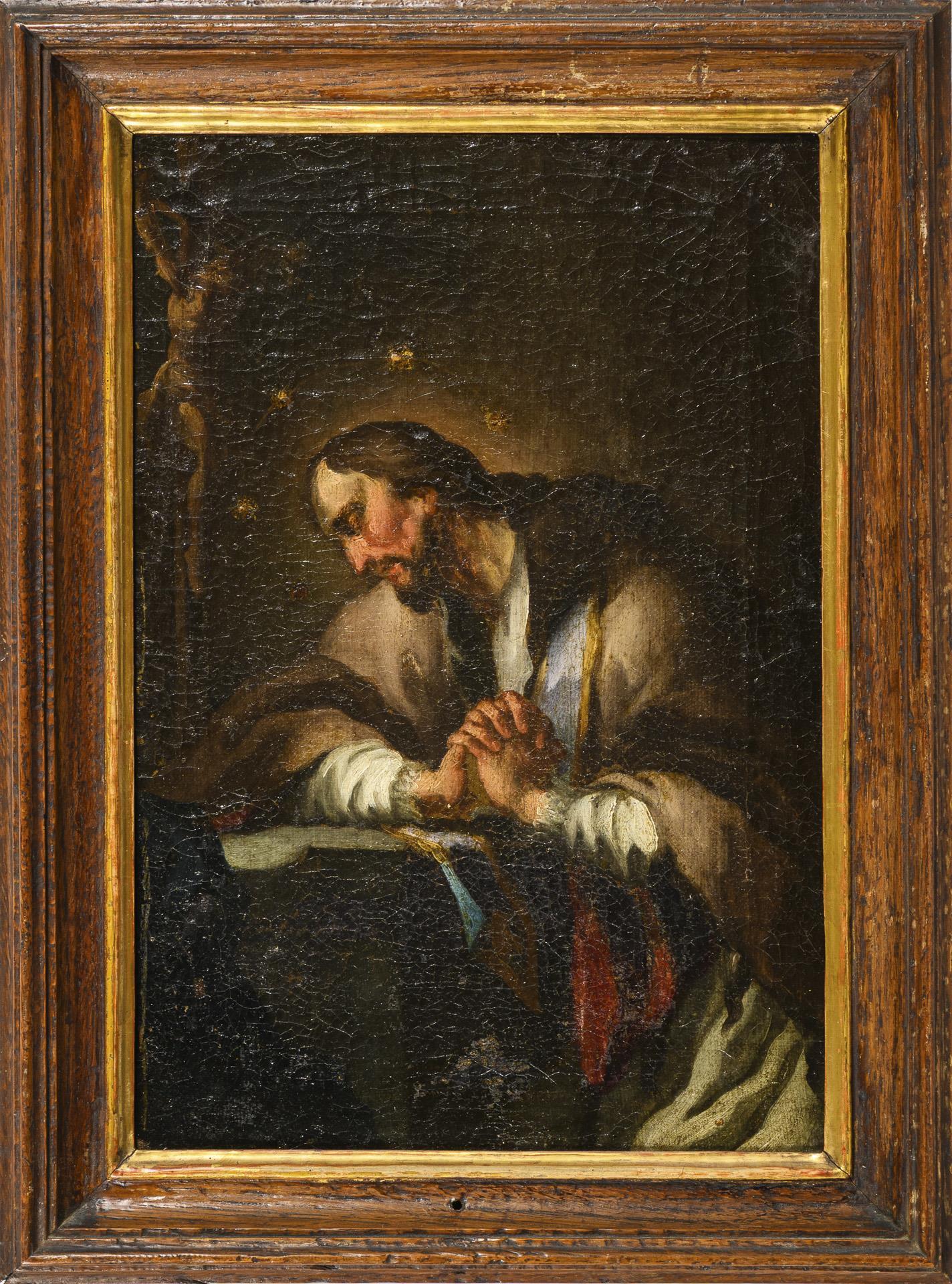 Hingebungsvoll vor einem Kruzifix Betender mit Heiligenschein. Altersspuren.