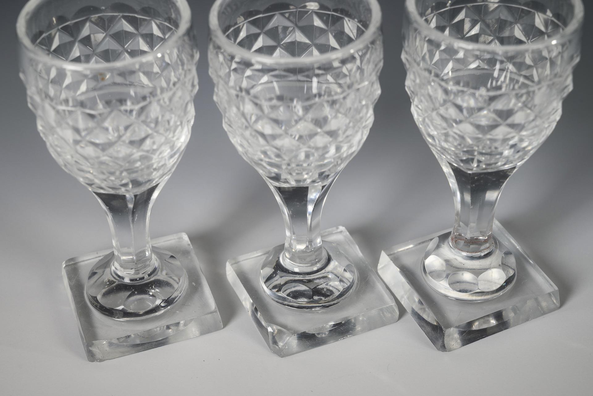6 Gläser mit Steinelschliffband auf der Kuppa, facettiertem Schaft und quadratischem Fuß; ausgekugelter Abriss. / 3x mit Olivenschliffbordüre und Kerbschliffkranz auf der Kuppa, facettiertem Schaft und quadratischem Fuß. Partiell Mündungs- und Fußrand minimal bestoßen.