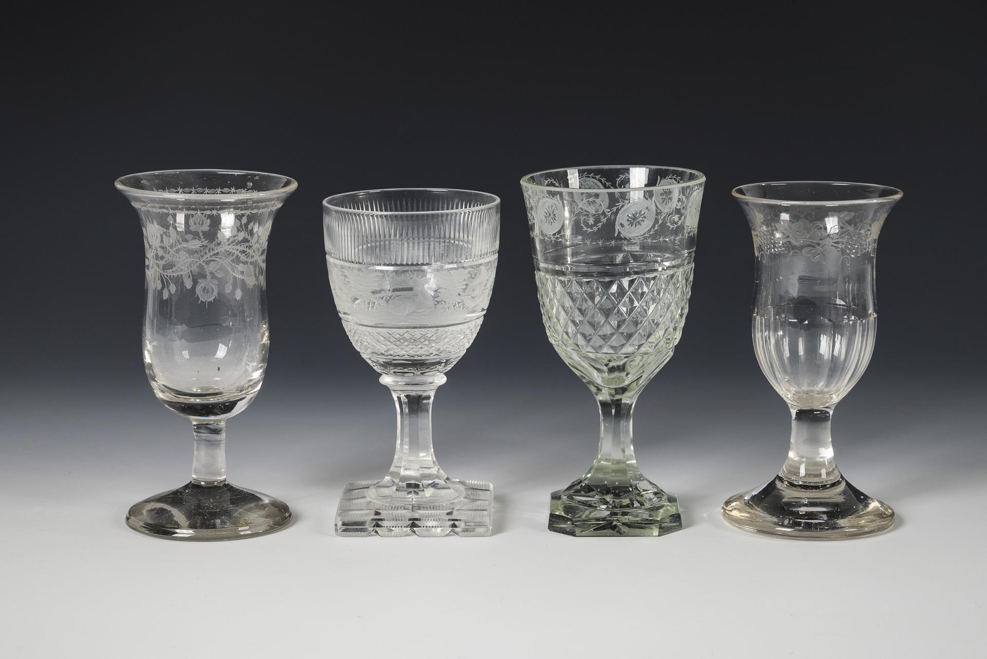 4 verschiedene Gläser mir vegetabilen Gravuren und teils mit Schliffdekor. 1x Bestoßungen am Quadratfuß.