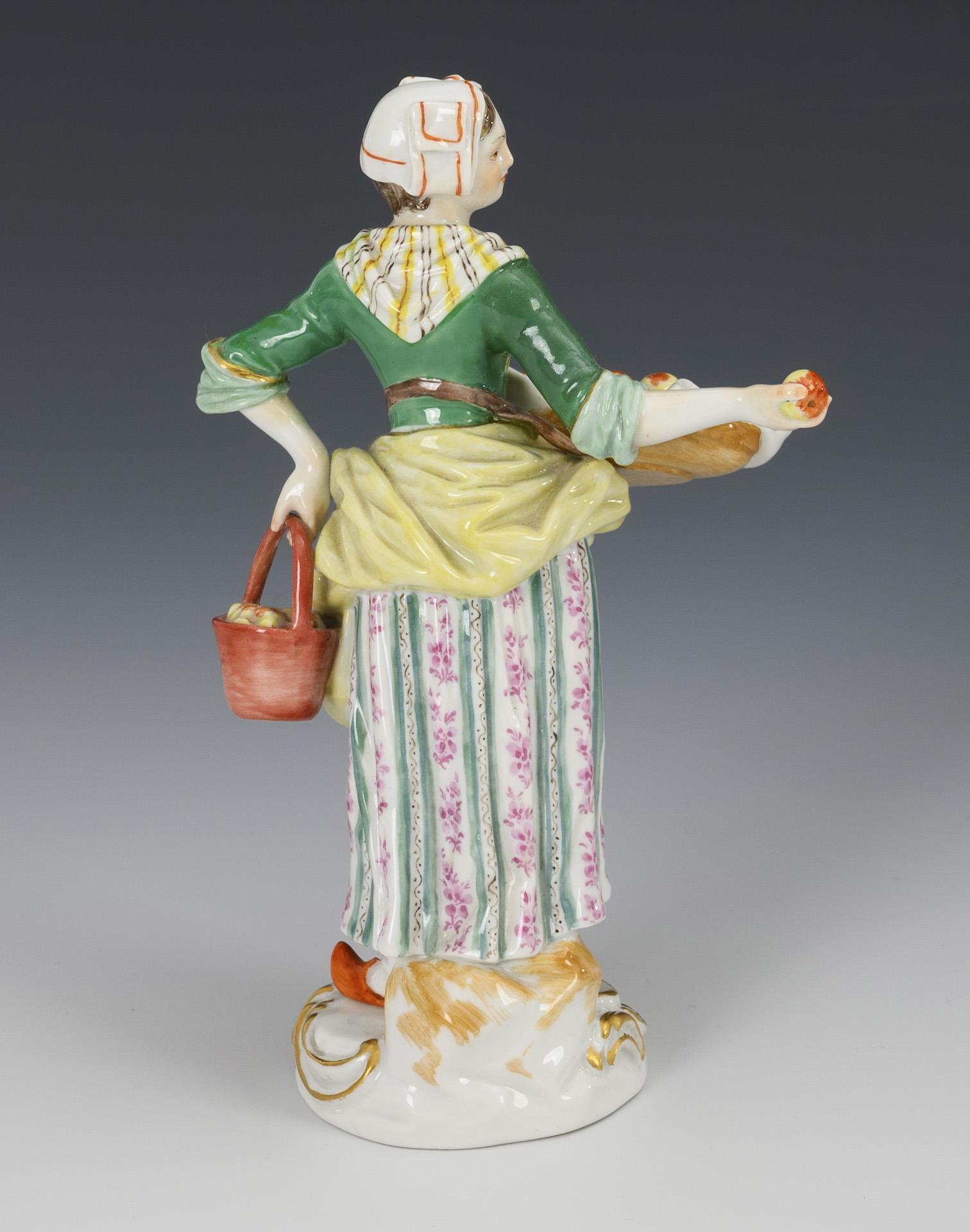 Auf einem Rocaillesockel stehende, Äpfel feilbietende Händlerin. Linker Arm restauriert.