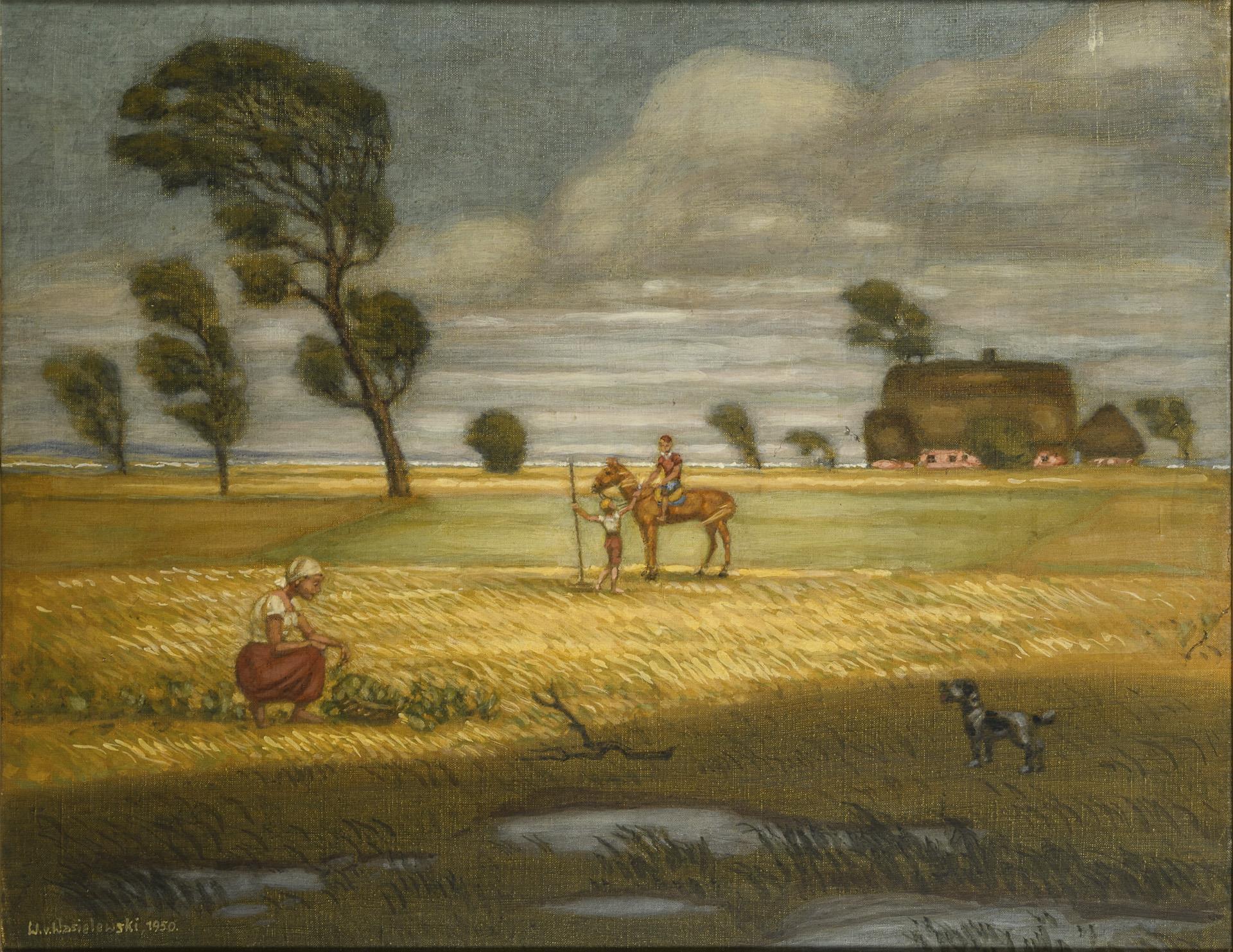 Weite ebene Landschaft mit reetgedecktem Haus und Personen auf den Feldern unter wolkigem Himmel bei windigem Wetter. Leichte Altersspuren.