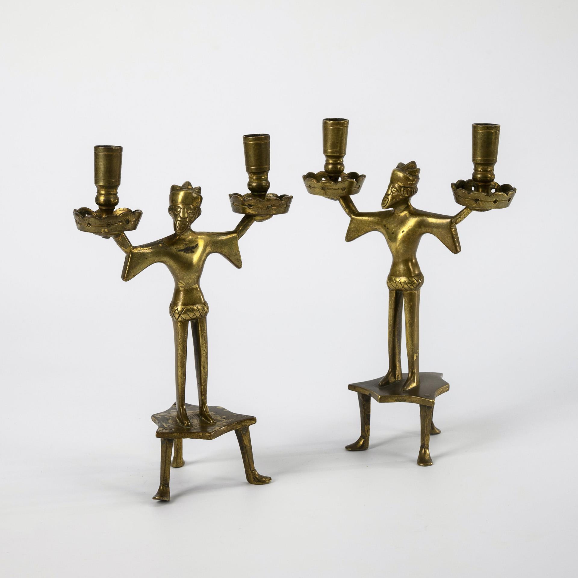 Nach dem Vorbild der Nürnberger Männleinleuchter um 1500 gegossene Figurenleuchter. 3-beiniger Sockel mit passiger Standplatte für den stehenden Mann, der mit erhobenen Armen die Tüllen mit Tropfschalen hochhält. Teils schiefe Beine und Tüllen, sonst wenige Alters-/Gebrauchsspuren.