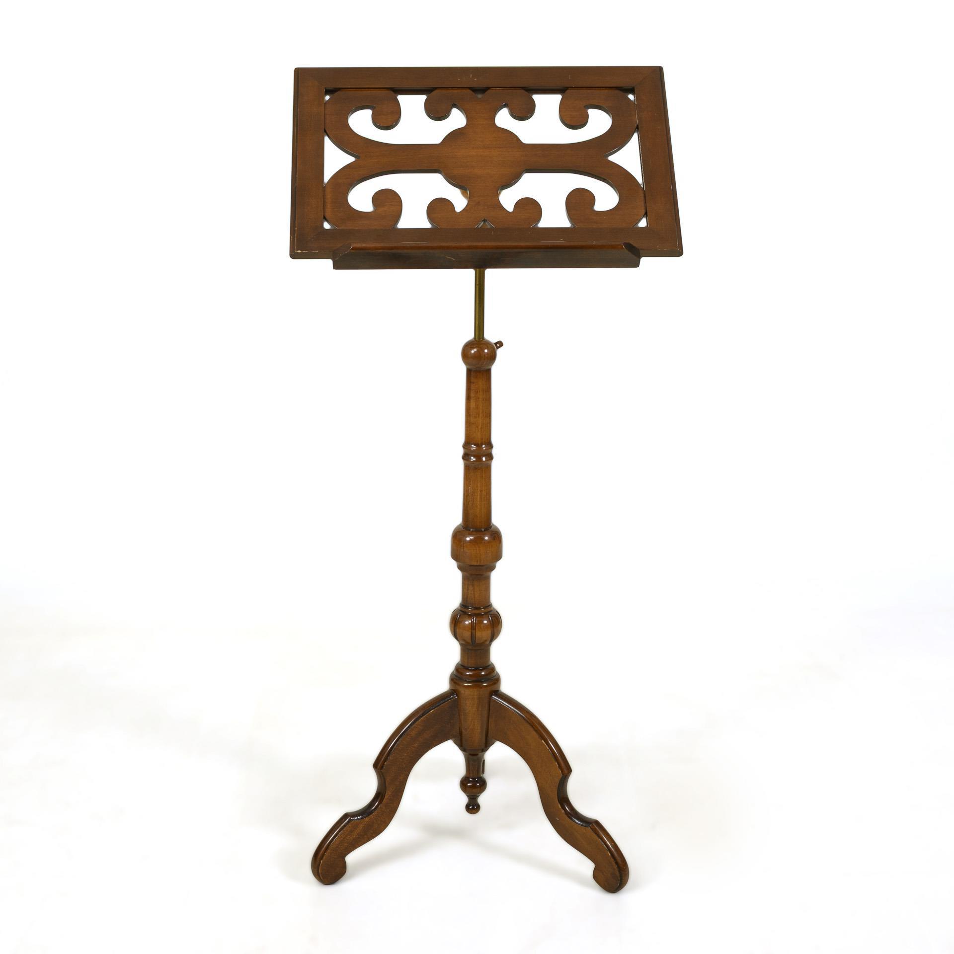 Stilisiert durchbrochene Notenablage auf Drechselschaft mit 3 geschweiften Füßen. Herausziehbare Messingstange, Arretierung durch gedrechselten Holzknauf. Partiell Schrammen und Furnierdefekte.