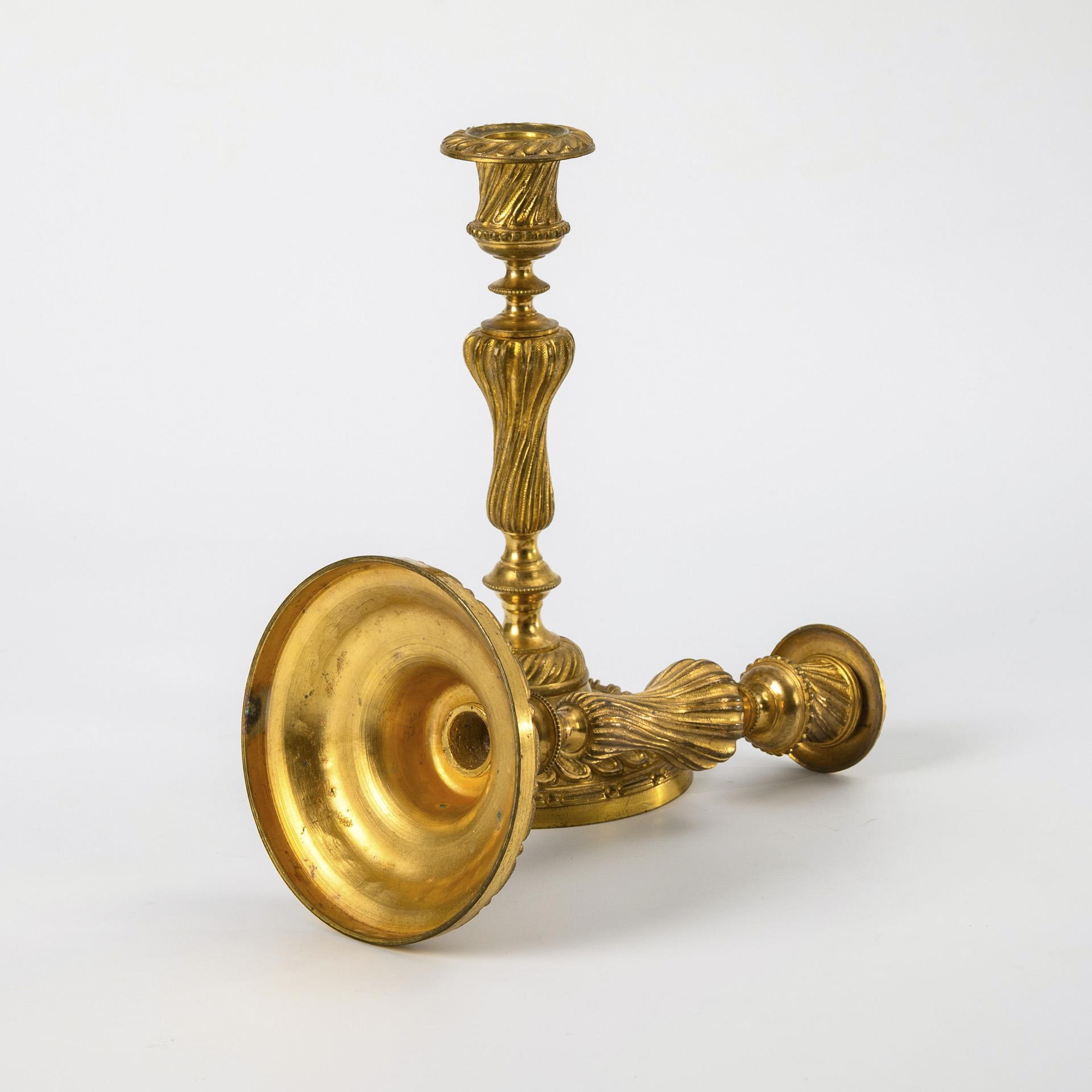 Im Stil des Louis XV. mit tordierten Kanneluren am Rundfuß, Balusterschaft und der Vasentülle verzierte Bronzeleuchter. Kaum Alters-/Gebrauchsspuren.