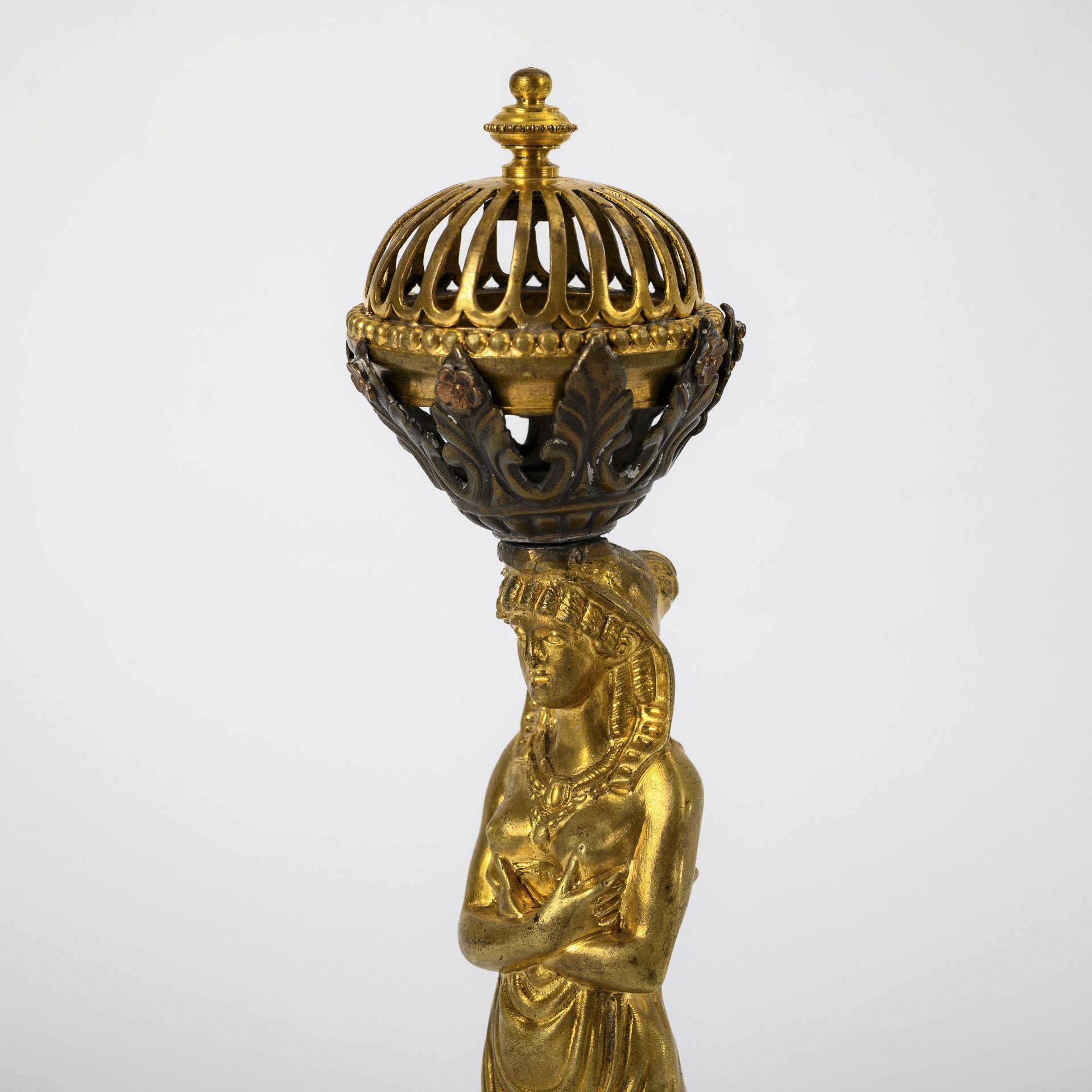Parfümbrenner mit Frauenfigur im ägyptisierenden Stil, die einen Blattkranz mit Korbdeckel als Cassolette auf dem Kopf trägt. Teile wohl nachträglich zusammengefügt.