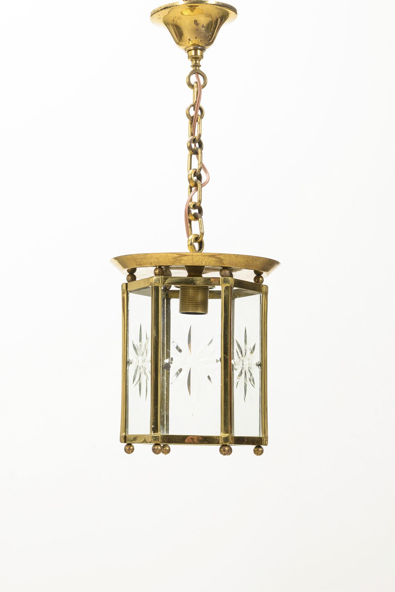 Hexagonale Deckenlampe mit Sternenschliff auf jedem Glas, runde Bedachung, Zierkette und Baldachin. Geringe Alters-/Gebrauchsspuren, Funktion nicht geprüft.