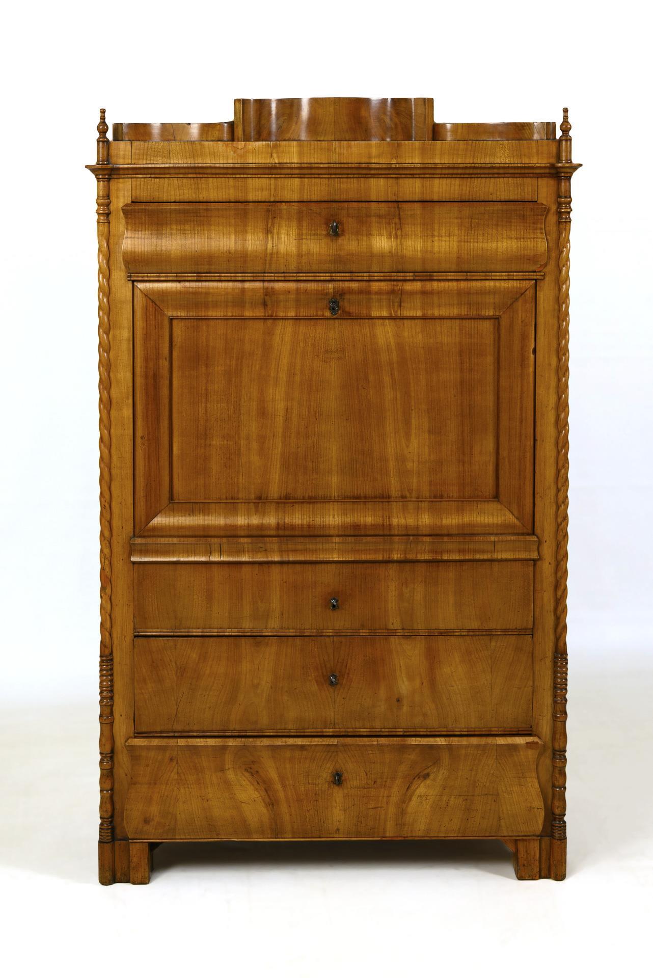 4-schübiger Schreibschrank mit kassettierter Schreibklappe und teilgeschwungener Front, gestufter Giebel mit zusätzlichem Geheimschub, gedrehte Drechselsäulen an den Ecken, auf 4 Klotzfüßen. Eingericht mit 1-türigem Mittelfach als Säulentorbogen mit 2 Scheintüren, flankiert von jeweils 3 seitlichen Schüben, 1 Kopfschub und 1 Sockelschub mit Treppe zum Mittelfach, verziert mit konturierenden Fadeneinlagen. Beinknäufe und schildförmige Schlüssellochbeschläge aus Messing. Restauriert, leichte Alters- und Gebrauchsspuren, partiell leichte Risse und Furnierdefekte, Knäufe teils ergänzt oder defekt, inaktiver Anobienbefall.