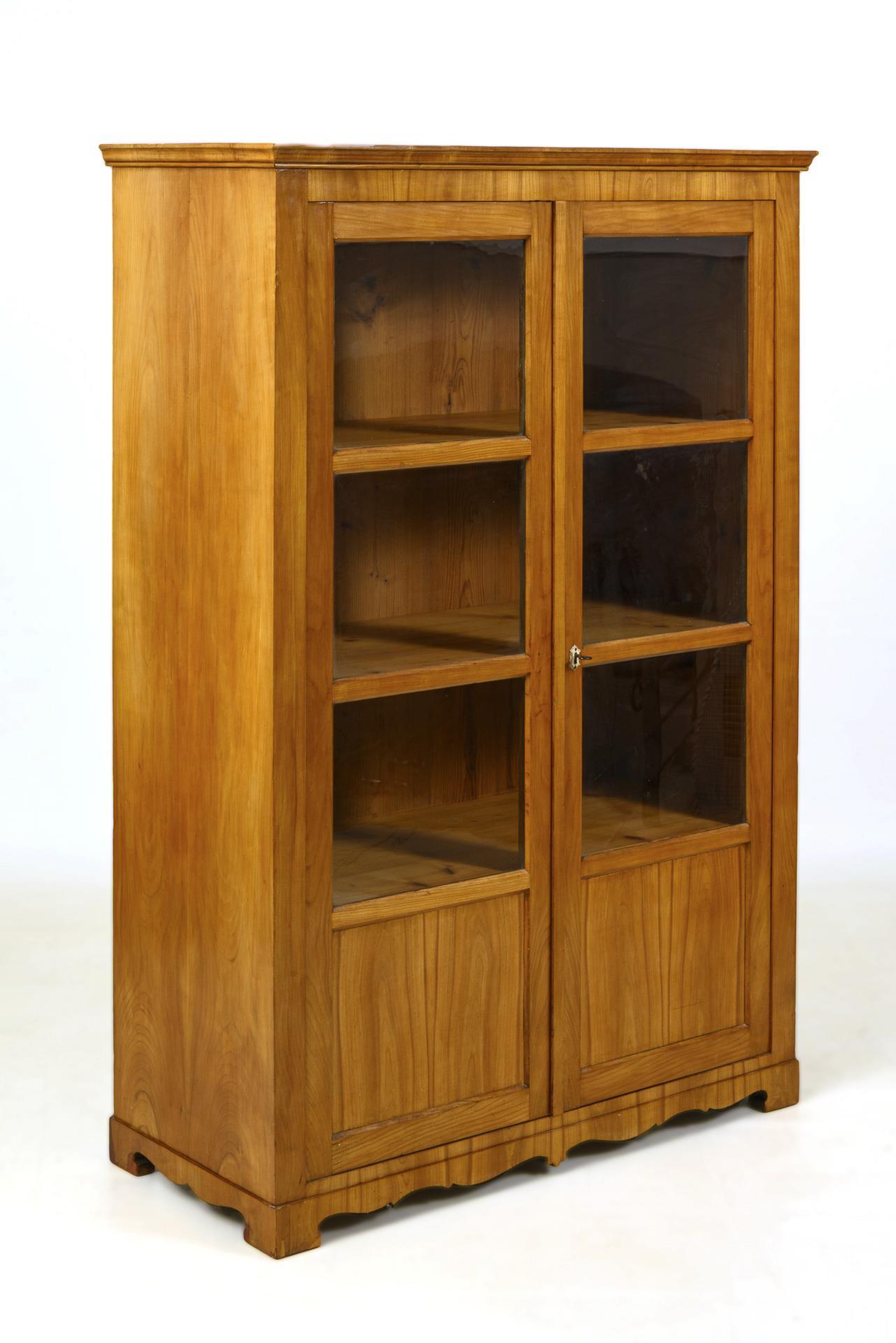 2-türiger, gesprosst verglaster Korpus mit Kranzgesims und geschweift geschnittenem Sockel. Innen 4 Fächer mit 3 Einlegeböden. Schildförmiger Schlüssellochbeschlag aus Bein. Restauriert, mit Ergänzungen, leichte Alters- und Gebrauchsspuren.