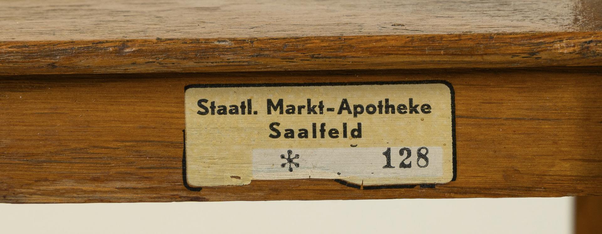 Verstrebtes Gestell mit Ablagefläche und 6 größendifferenten Fächern, seitliche Vertikalversprossung, geschweift geschnittene Zwickel im Sockelbereich, auf 4 Rollenfüßen. Leichte Gebrauchsspuren, partiell Risse und Defekte.