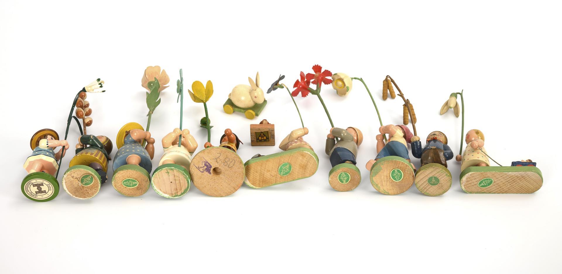 Kleines Karussell zum Andrehen von Hand (H 8 cm), 10 Blumenkinder Wendt & Kühn sowie 2x andere Hersteller (H 11 - 13 cm). Dazu 2 Häschen. Altersspuren, kleine Defekte.