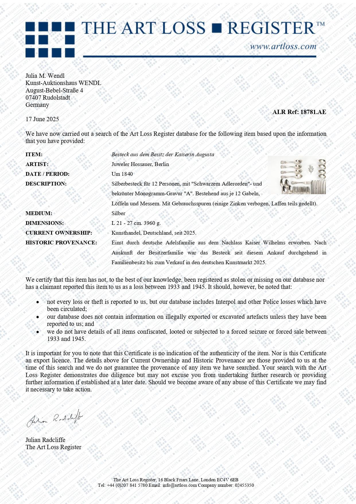 Provenienz : Nachtrag vom 12.06.2025: Einst durch deutsche Adelsfamilie aus dem Nachlass Kaiser Wilhelms erworben. Nach Auskunft der Besitzerfamilie war das Besteck seit diesem Ankauf durchgehend in Familienbesitz bis zum Verkauf in den deutschen Kunstmarkt 2025.