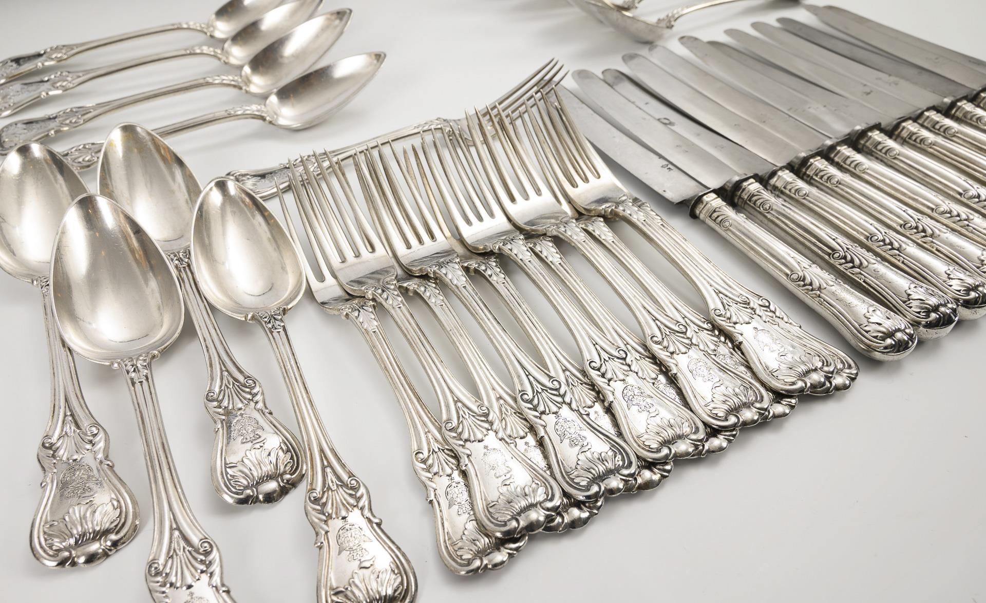 Reliefiertes Silberbesteck für 12 Personen, mit "Schwarzem Adlerorden"- und bekrönter Monogramm-Gravur "A". Bestehend aus je 12 Gabeln, Löffeln und Messern. Mit Gebrauchsspuren (einige Zinken verbogen, Laffen teils gedellt).