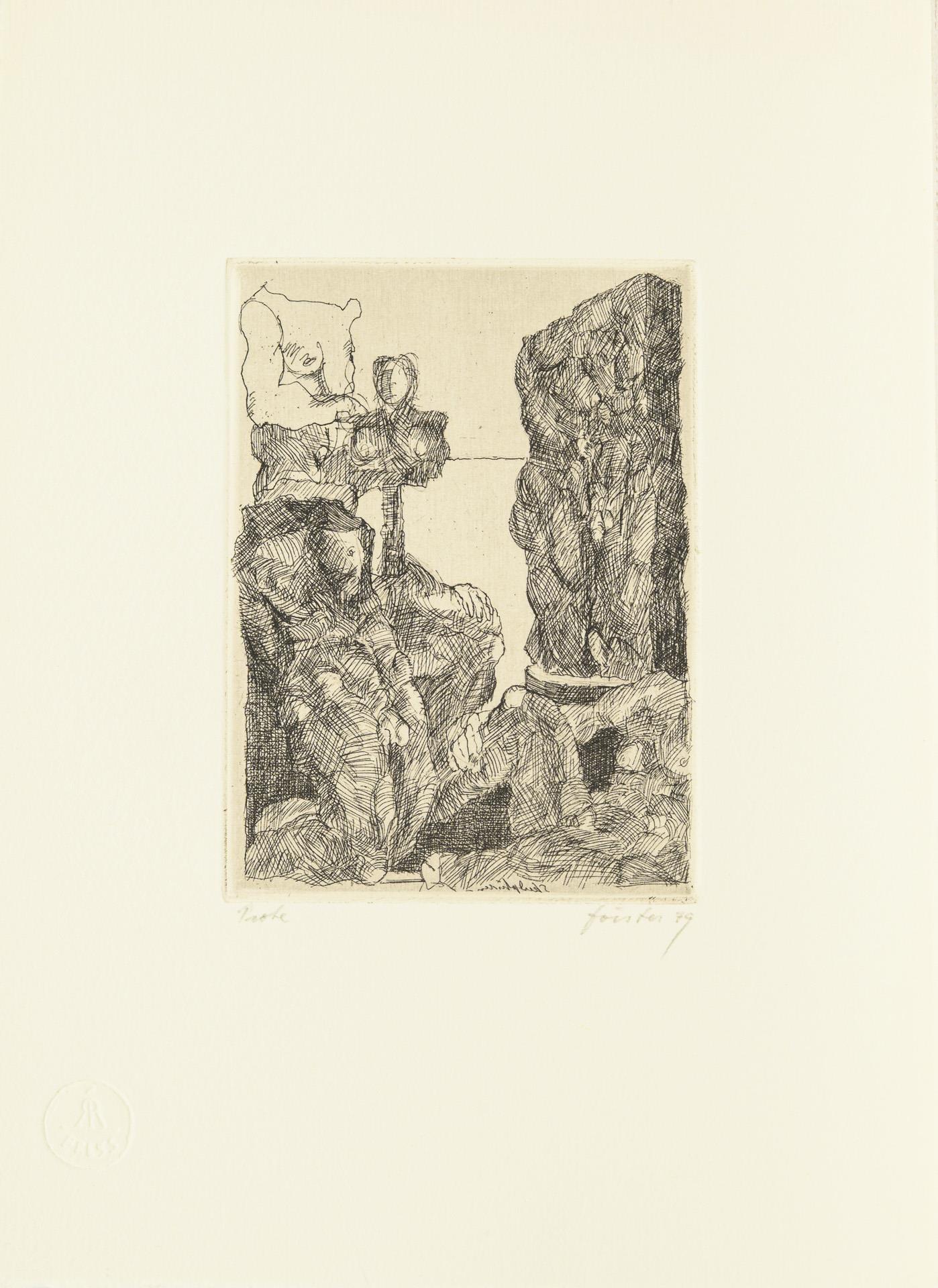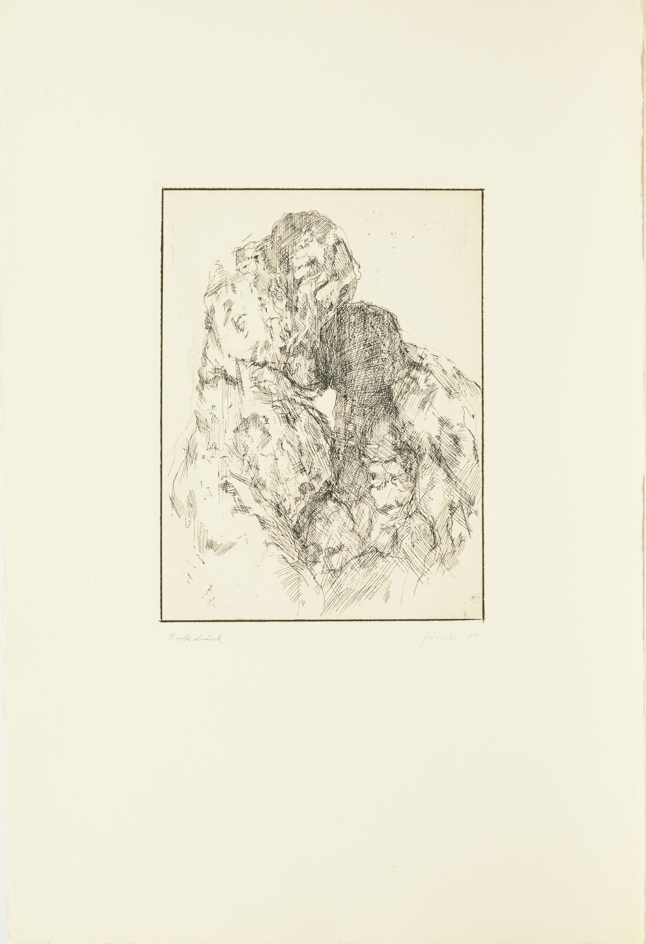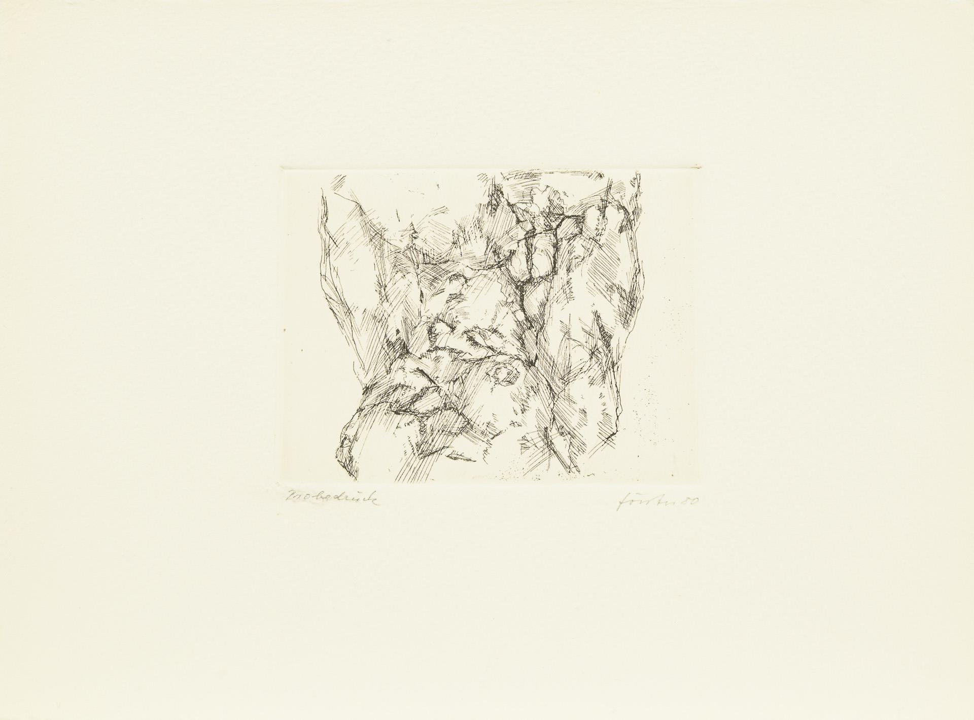 Hauptsächlich als Probedrucke bezeichnete Arbeiten in unterschiedlichen Formaten. Dazu Buch: "Liebe und Tod, Werklinien, Wieland Förster, Plastik und Zeichnungen", Magdeburg 1995, 94 Seiten mit einer beiliegenden Originalgrafik (nummeriert 42/50, signiert und datiert (19)95. / Buch "Werner Stötzer, Neue Arbeiten", Neuer Berliner Kunstverein 1995, 45 Seiten, mit einer beiliegenden Originalradierung (Handsignatur, nummeriert 14/50, 1995). Eine Lithographie mit Knick in der Ecke, sonst nur minimale Altersspuren.