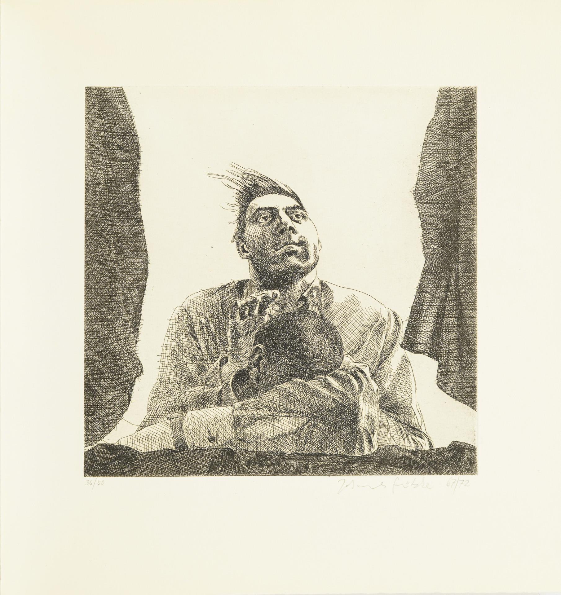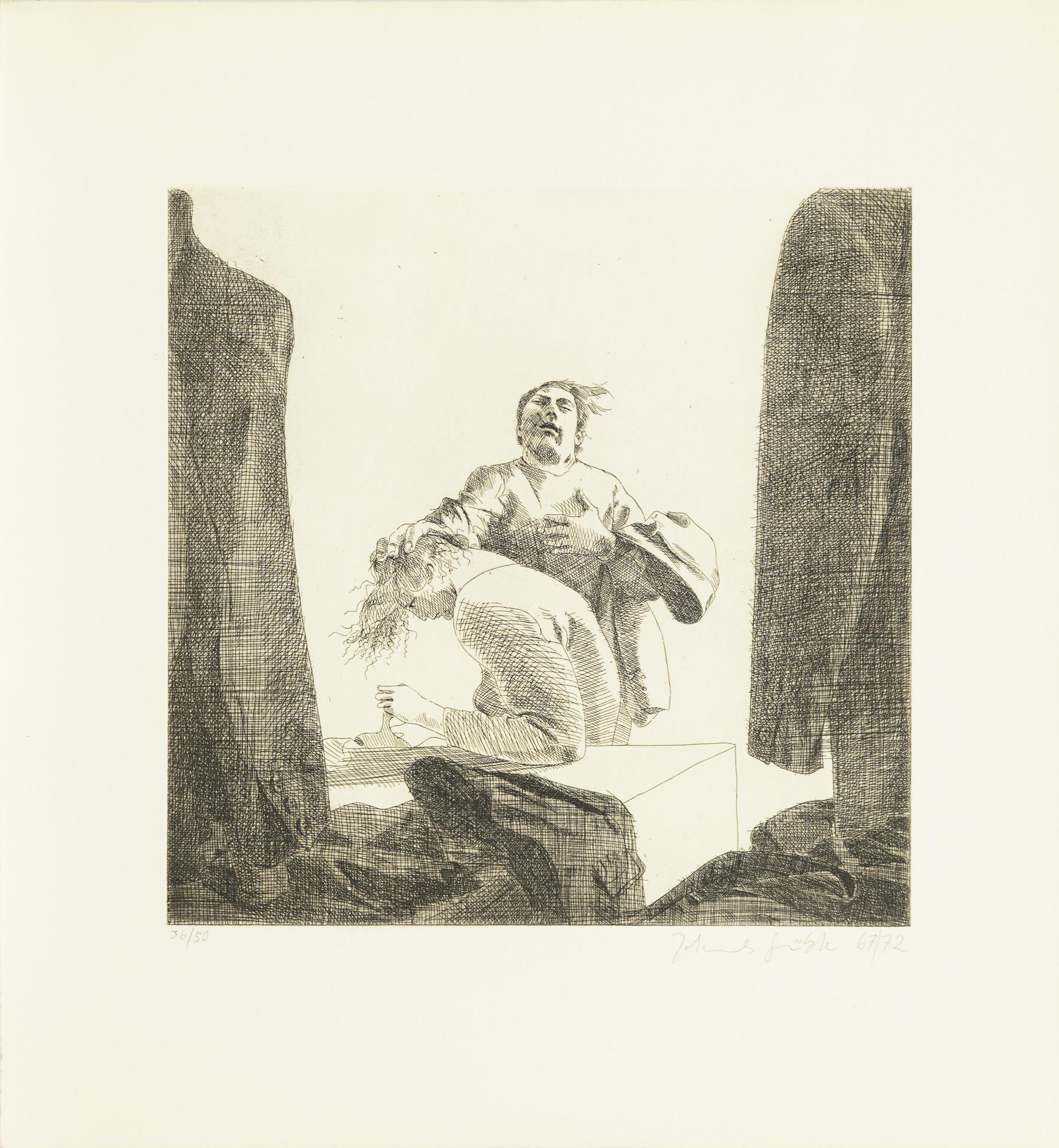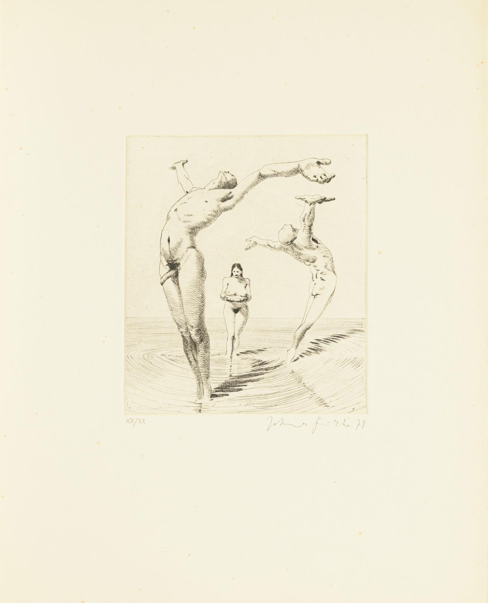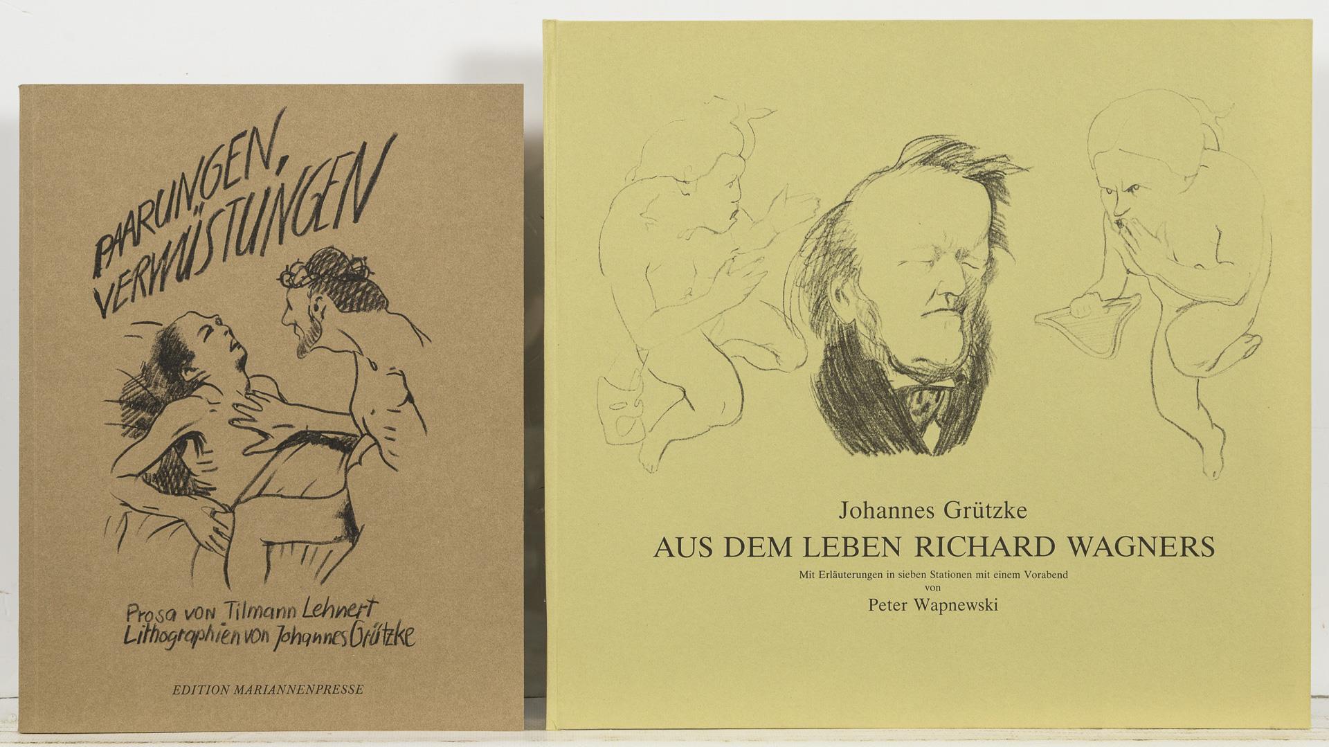 "Aus dem Leben Richard Wagners", Merlin Verlag, Gifkendorf 1983, nummeriertes Exemplar 61/500, mit Künstlersignatur, 27 Seiten, 30 x 32 cm. / "Paarungen, Verwüstungen", Prosa von Tilmann Lehnert, Lithographien von Johannes Grützke, Edition Mariannenpresse, nummeriertes Exemplar 58/200 mit Künstlersignaturen, Broschur 52 Seiten, 27 x 21 cm. / Mappe "Die Teddy-Fritz-Pabst-Story" Text Tilmann Lehnert, 5 Radierungen von Johannes Grützke, Galerie Andre, Berlin 1972, Blätter nummeriert 36/50, alle mit Bleistiftsignatur, Mappe 40 x 37 cm. / Radierung mit erotischer Szene, nummeriert 20/20, Bleistiftsignatur, datiert (19)78, Blatt 35 x 28 cm.