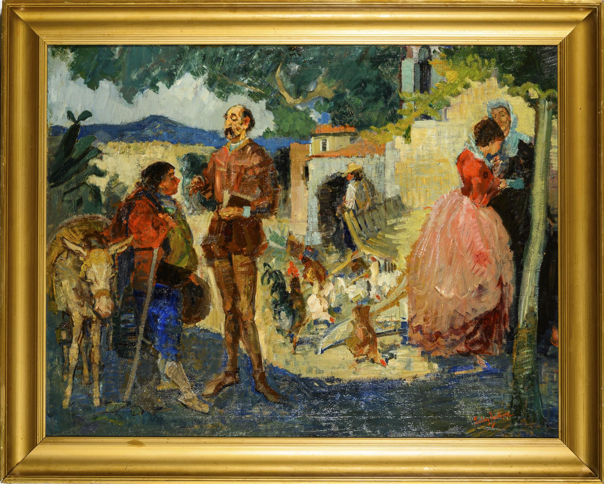 Die beiden literarischen Figuren mit dem Esel im Schatten der Bäume vor einem Hof mit Geflügel. Leichte Altersspuren.