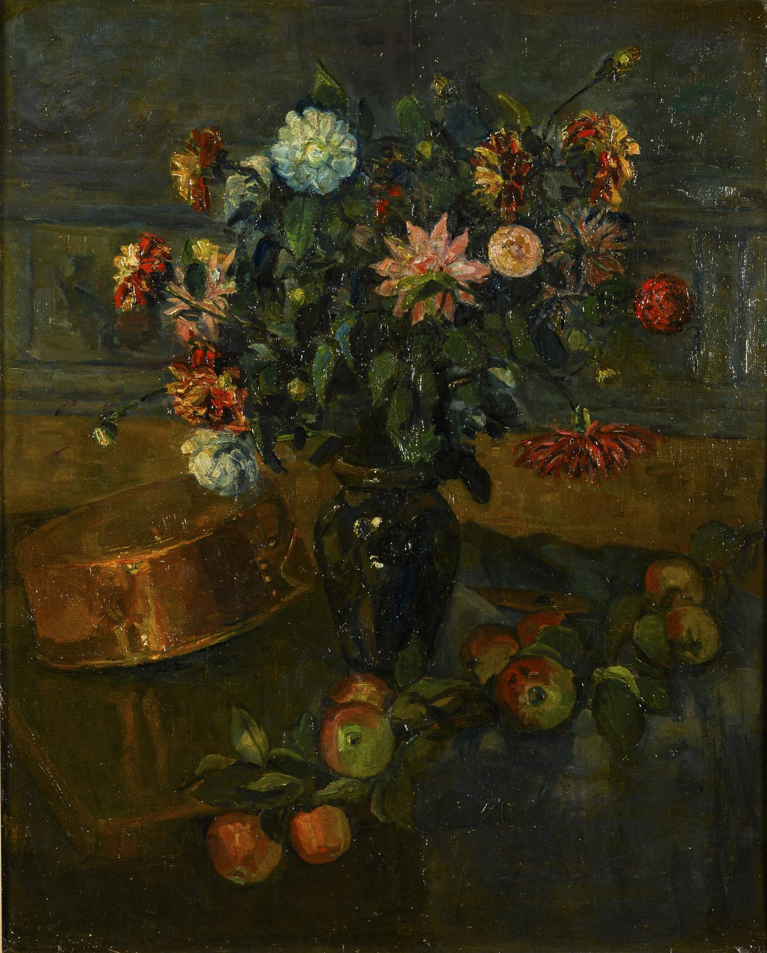 Großer Blumenstrauß mit herrlichen Blüten in einer dunklen Vase neben Äpfeln und einem Kupfergefäß. Retuschiert.