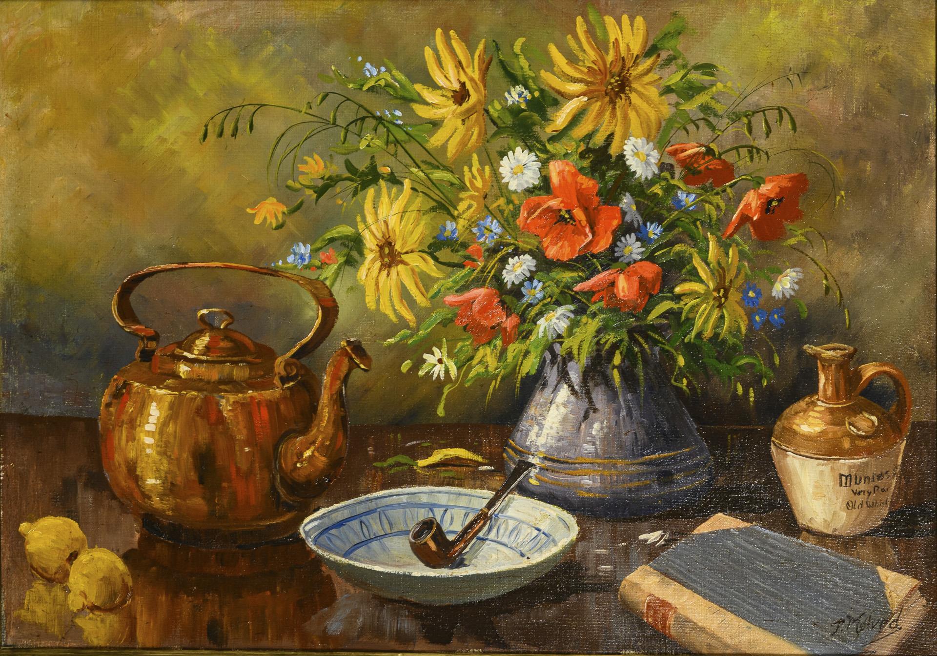 Wiesenblumen neben kupferner Teekanne, einer Pfeife auf einem Teller sowie einem Buch und einer Kanne.