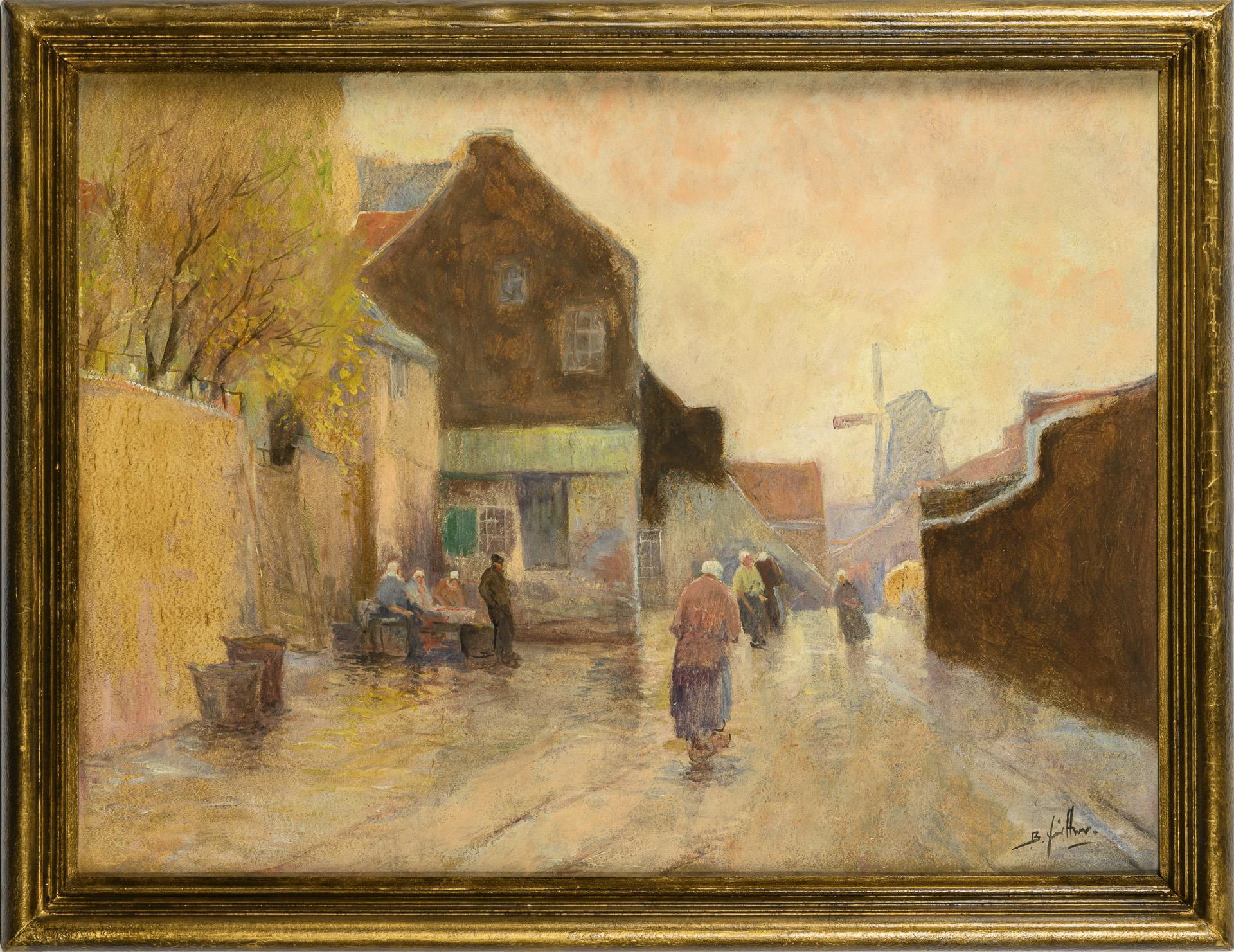 Straßenszene mit Staffagefiguren vor den Häusern mit Blick zur Windmühle unter hellem Himmel.