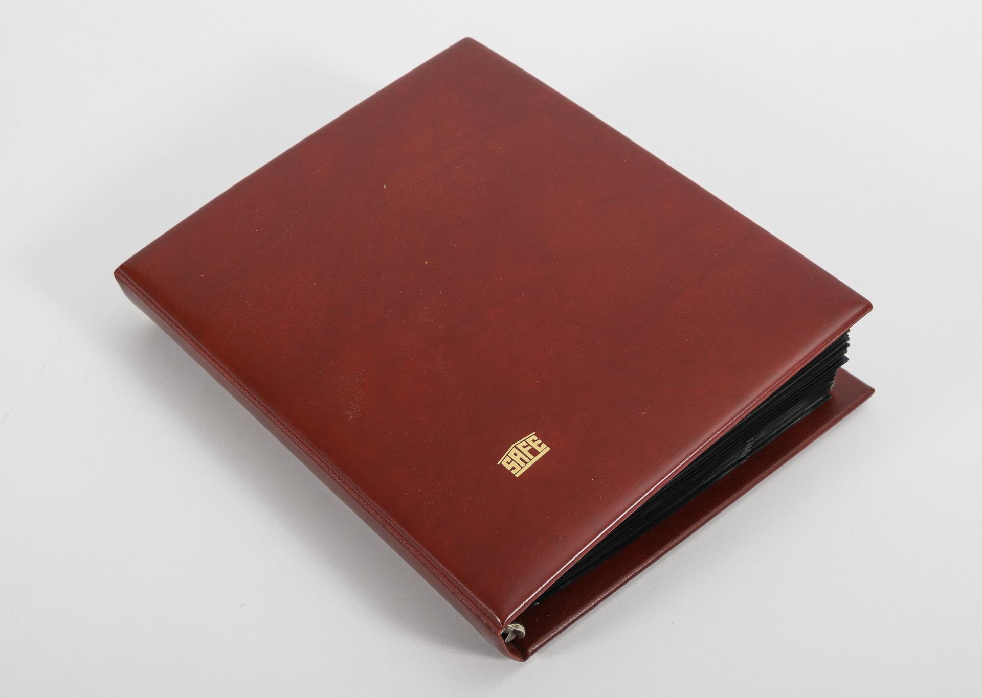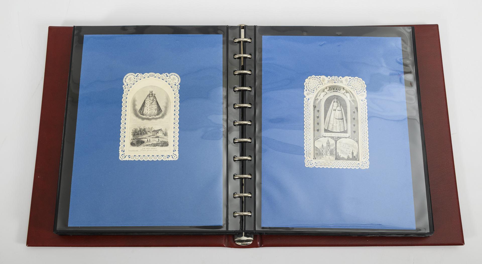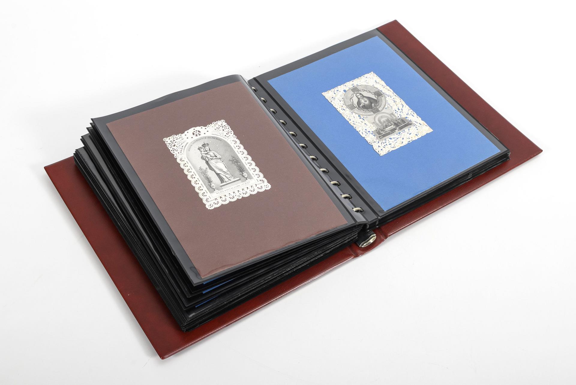 Kolorierte, teils goldstaffierte Lithografien und Farblithografien, teils mit Appliken u.a. aus Seide, 1 Scherenschnitt, 1x bestickt; zumeist mit geprägten Stanzrahmen; je eingeklebt. Schuber und Ordner aus rotem Kunststoff mit Lederoptik. Bilder maximal 17 x 11 cm. Schuber 30 x 23 x 6 cm. 2,3 kg.
