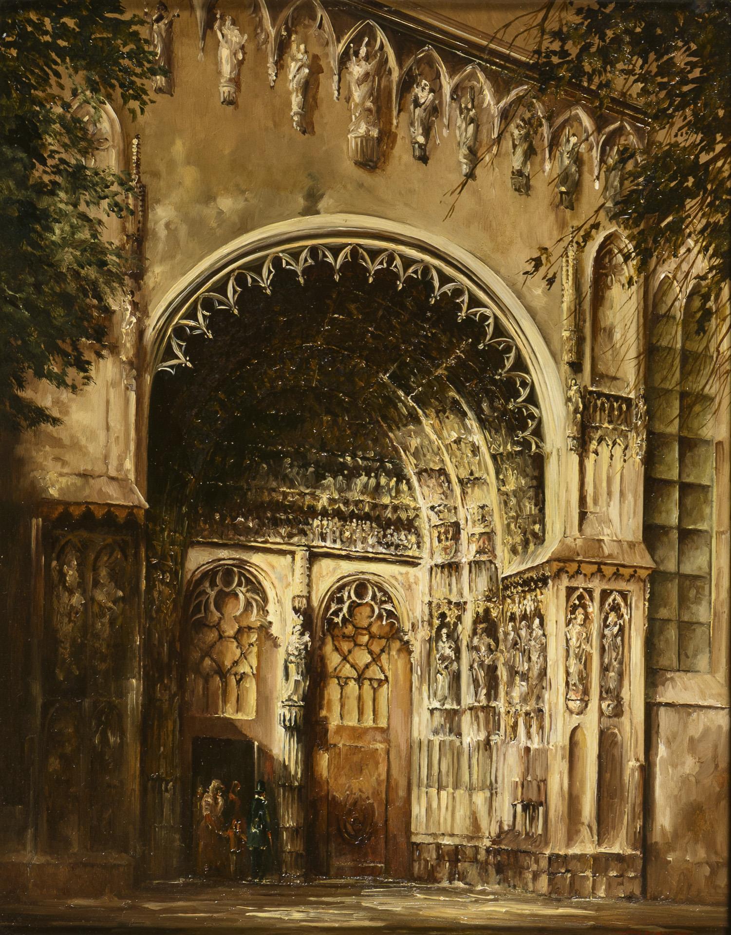 Staffagefiguren am Eingang des Portals bei einfallendem Sonnenschein.