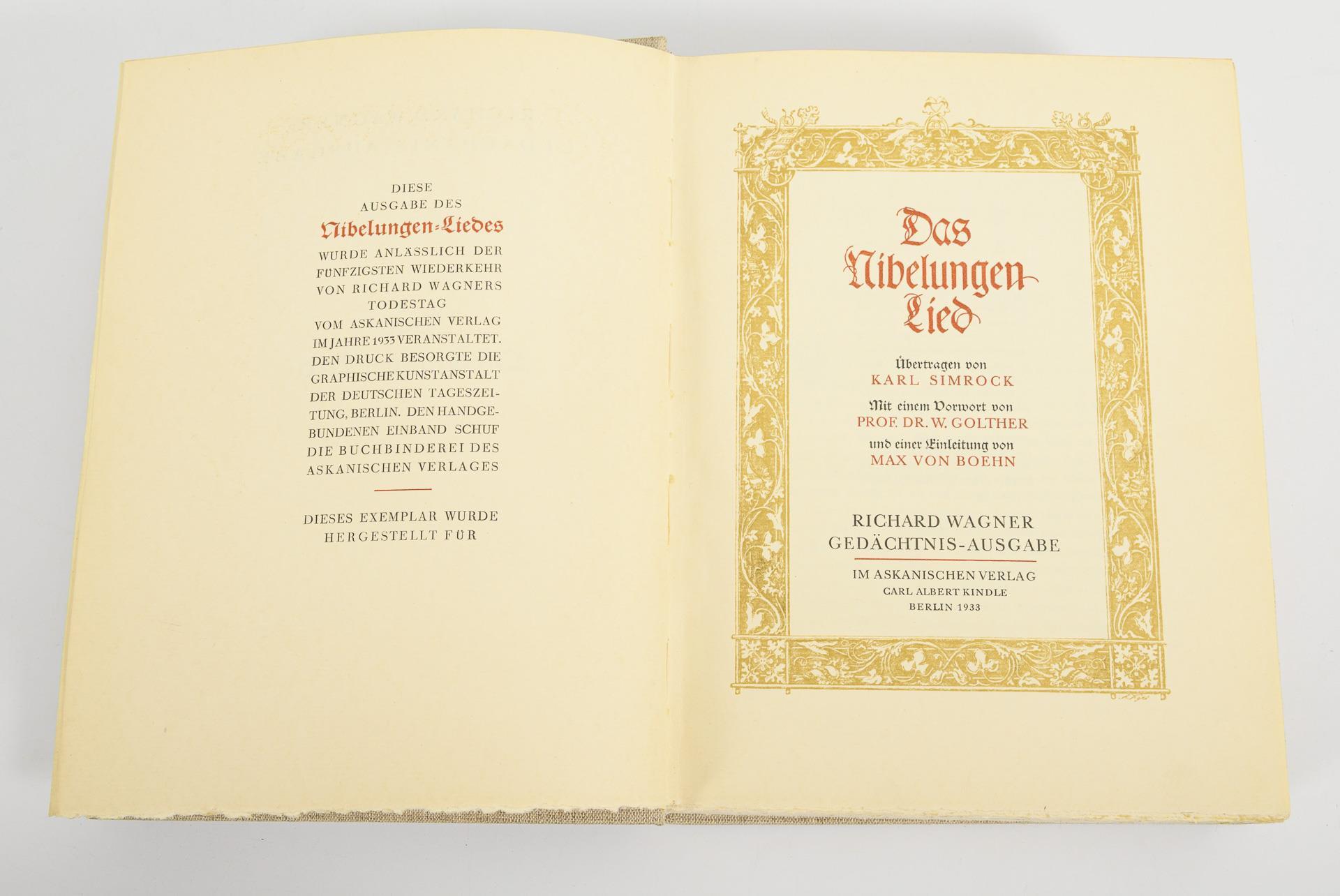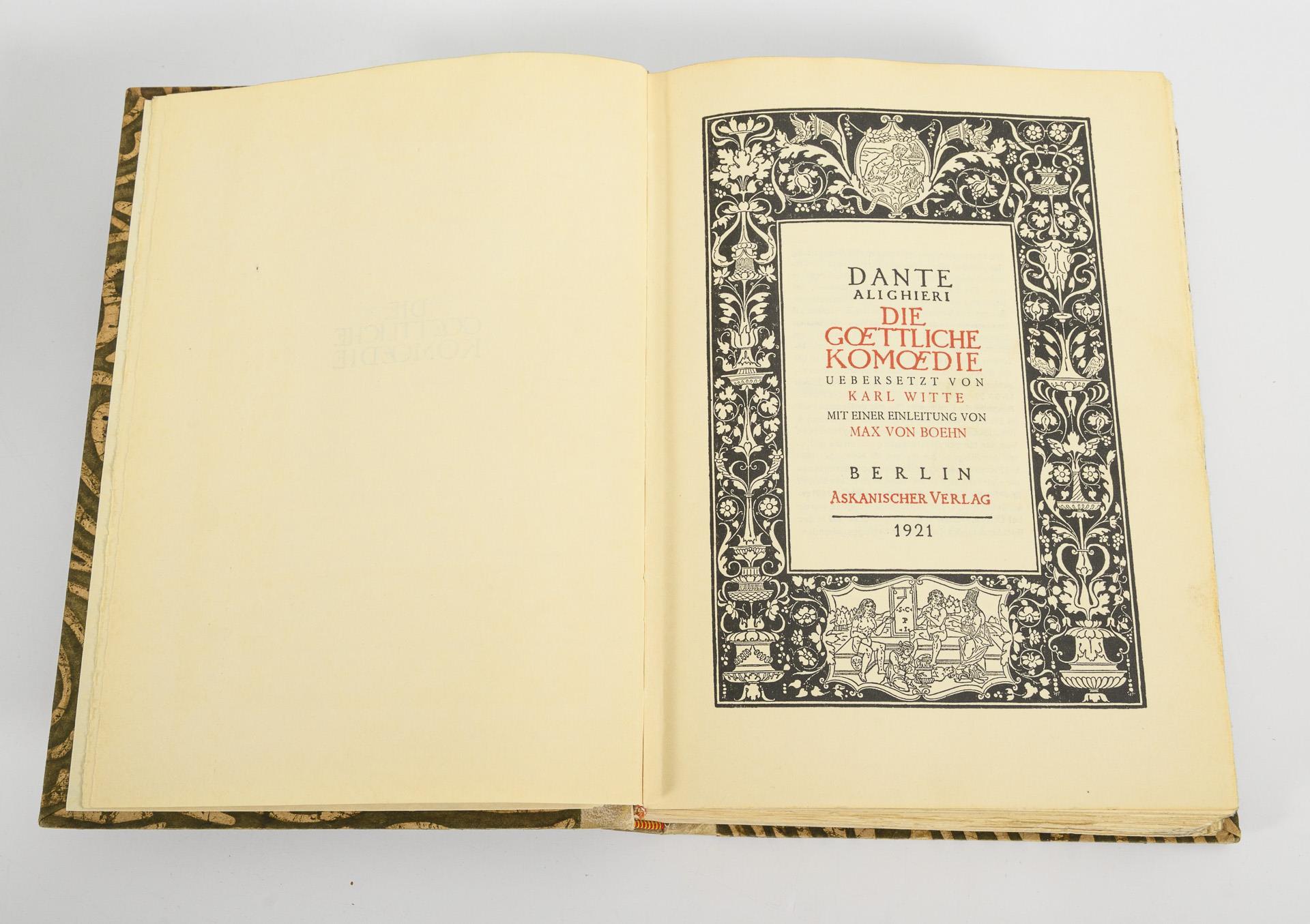 Dante Alighieri. "Die Goettliche Komödie", Askanischer Verlag, Berlin 1921. Übersetzt von Karl Witte, Einleitung von Max von Boehn. 574 Seiten mit Illustrationen in verschiedenen Techniken. Halbpergamenteinband. / Richard Wagner Gedächtnis-Ausgabe, Im Askanischen Verlag Carl Albert Kindle, Berlin 1933, 426 Seiten mit eingeklebten Illustrationen, im Leineneinband .