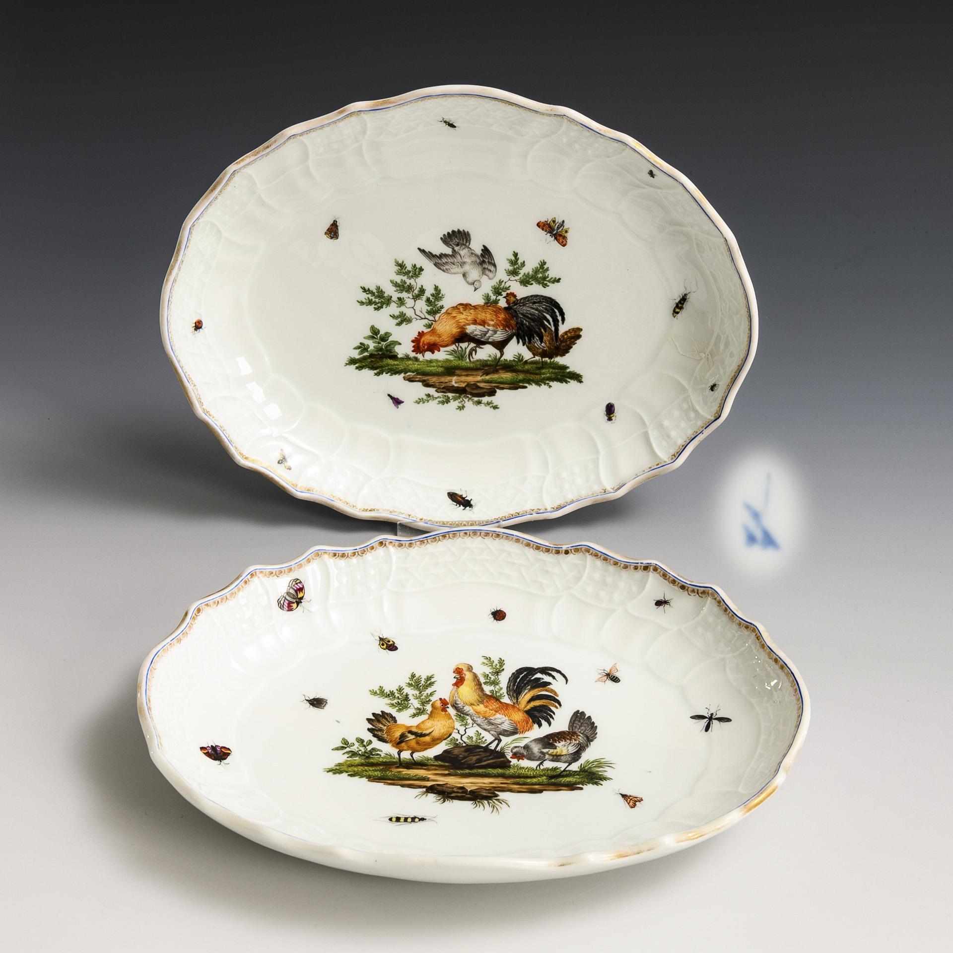 Form "Neubrandenstein". Ovale Schalen mit der Darstellung von Hahn und Hühnern im Spiegel. Gold berieben, 1x restaurierte Haarrissspinne an der Fahne.