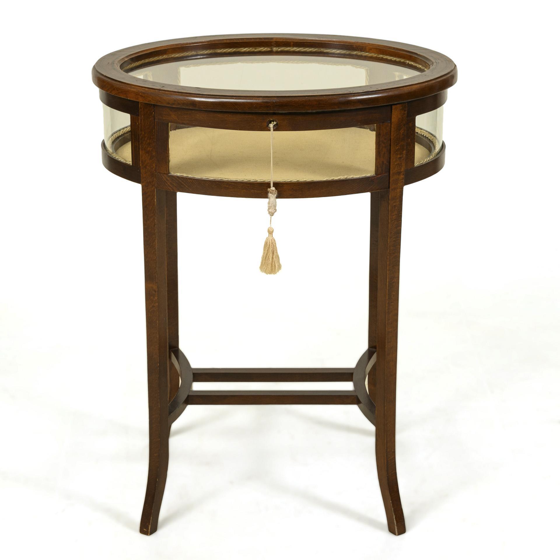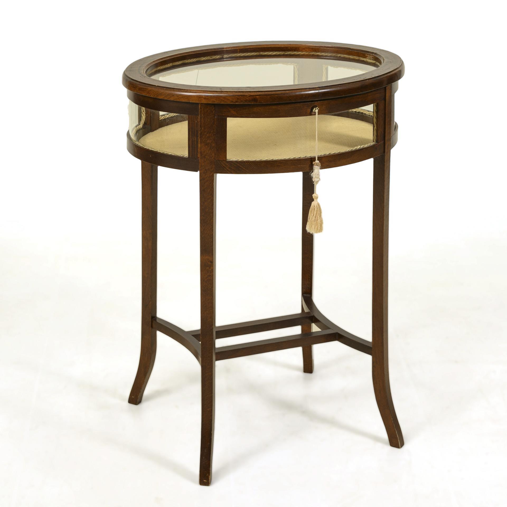 Ovaler 5-seitig verglaster Vitrinenkasten mit klappbarer Deckplatte, auf verstrebtem Gestell mit versprosster Zwischenablage. Innen crèmefarbener Stoffbelag und umlaufende Kordelbänder. Rückseitige Scheibe gesprungen, partiell Gebrauchsspuren und Defekte, Deckplatte mit leichtem Nachdruck schließend.