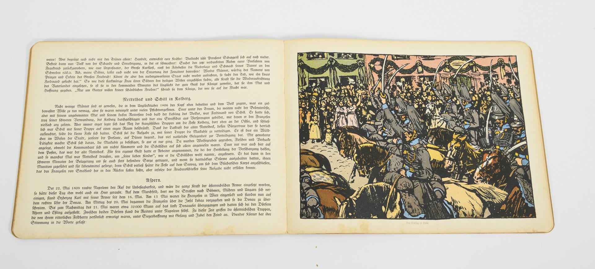 Herausgeber Wilhelm Kotzde: "Zehn Jahre deutscher Not (1803 - 1812)" / "Die Wacht am Rhein" / "Nach Frankreich hinein (1814-1815)" / "Frühling und Freiheit (1813)" alle mit Bildern von Angelo Jank. / "Bismarck" mit Bildern von Karl Bauer. Immer 8 Seiten mit Farblithografien, im Halbleineneinband. Altersgemäße Gebrauchsspuren, ein Buch mit eingerissenem Deckel.