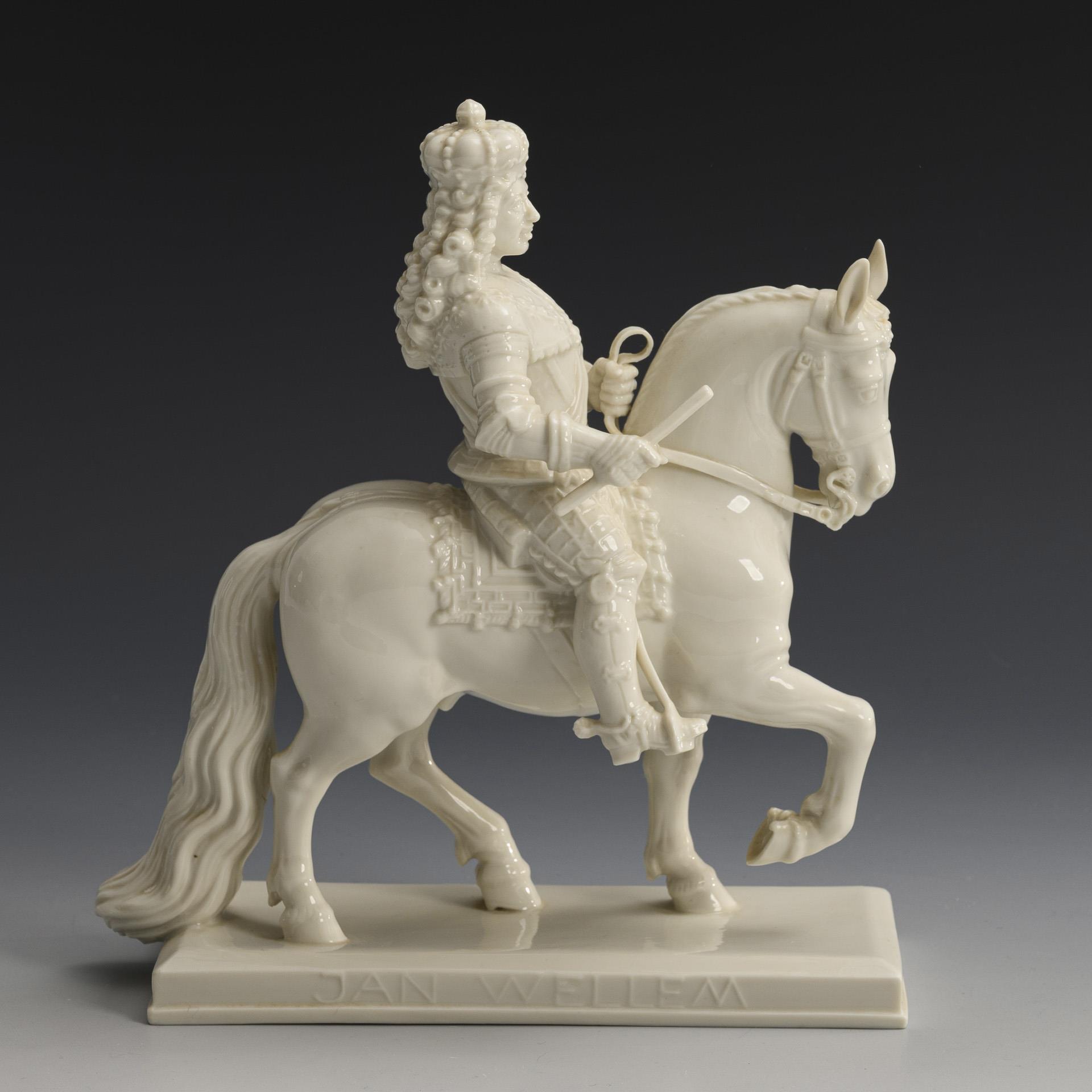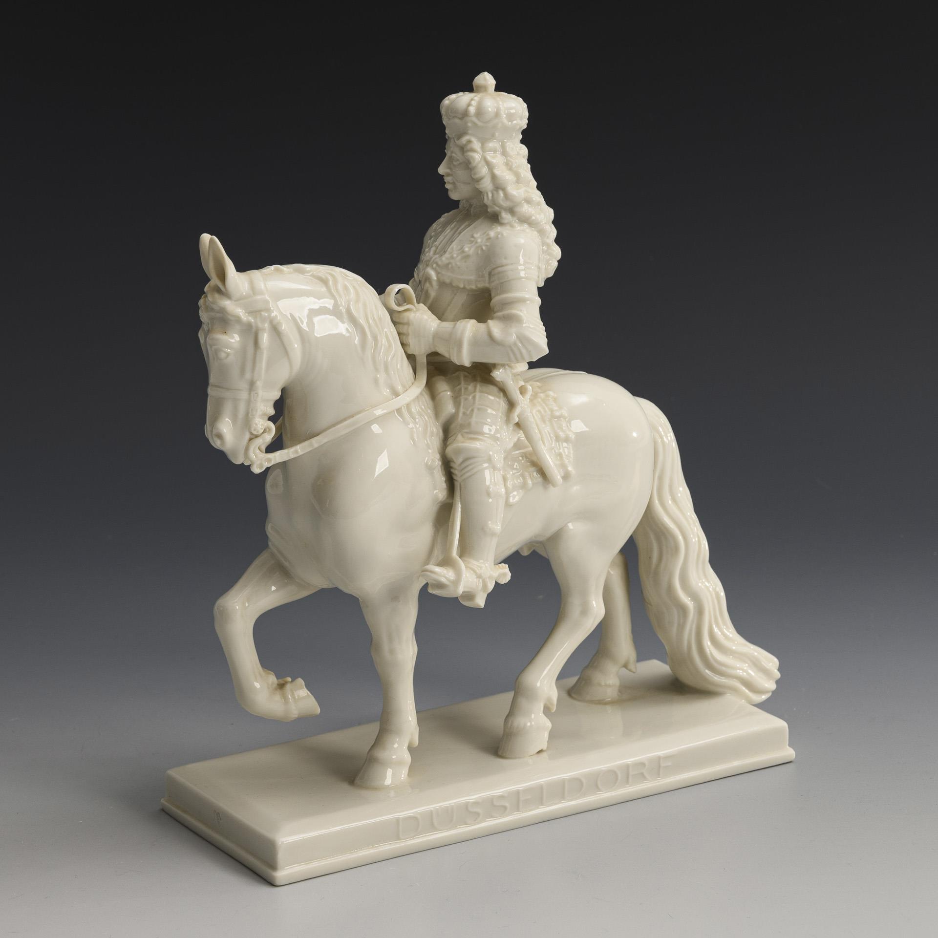 Kopie des Düsseldorfer Reiterdenkmals für Jan Wellem (= Kurfürst Johann Wilhelm von der Pfalz, 1658–1716) mit Sockelbezeichnung „Jan Wellem Düsseldorf”. Degen bestoßen.