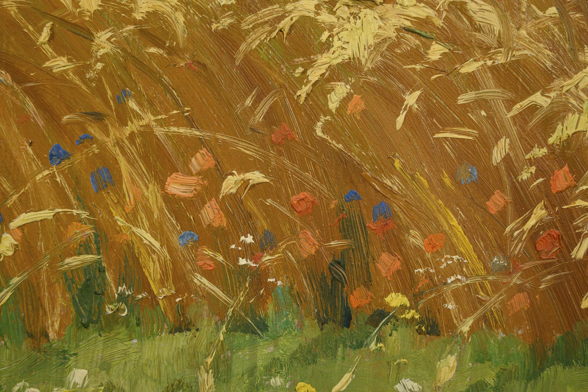 Blühende Wiese am Wegesrand vor dem gelben Kornfeld unter blauem Himmel.