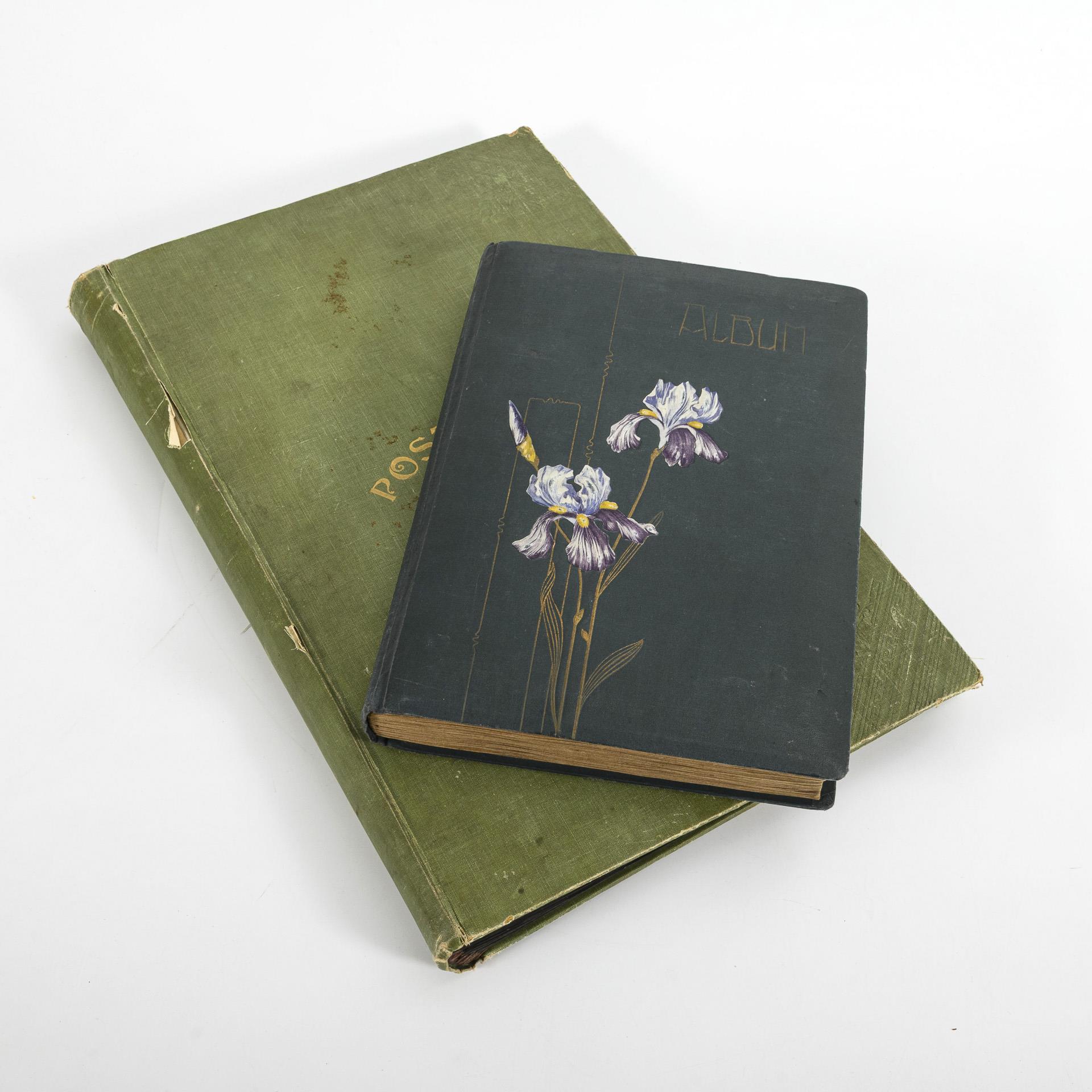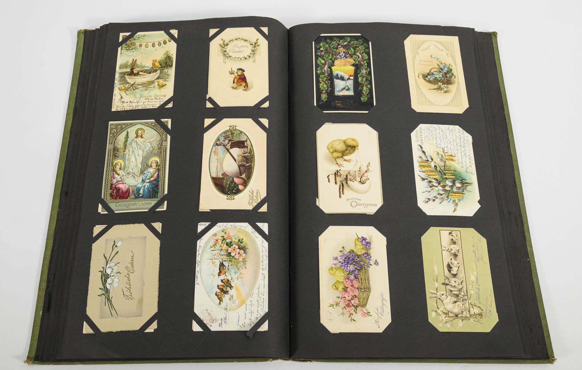 Viele geprägte Lithografien, um 1900/10. Im sehr großen grünen "Post-Cards" Album und einem dunklen "Album" mit Lilien.