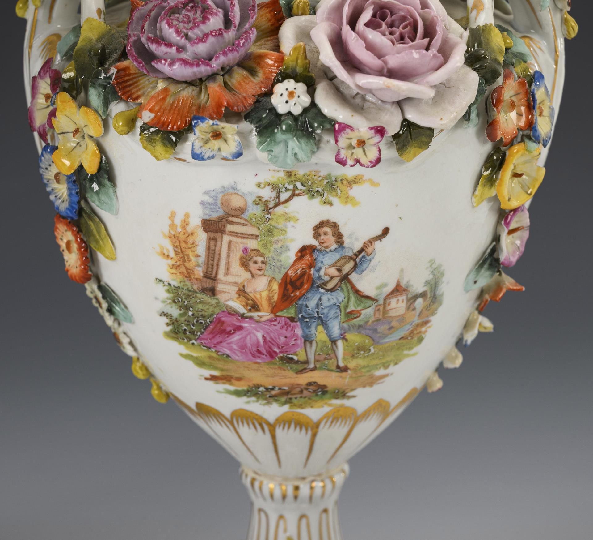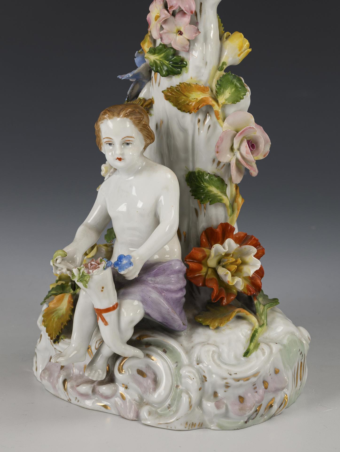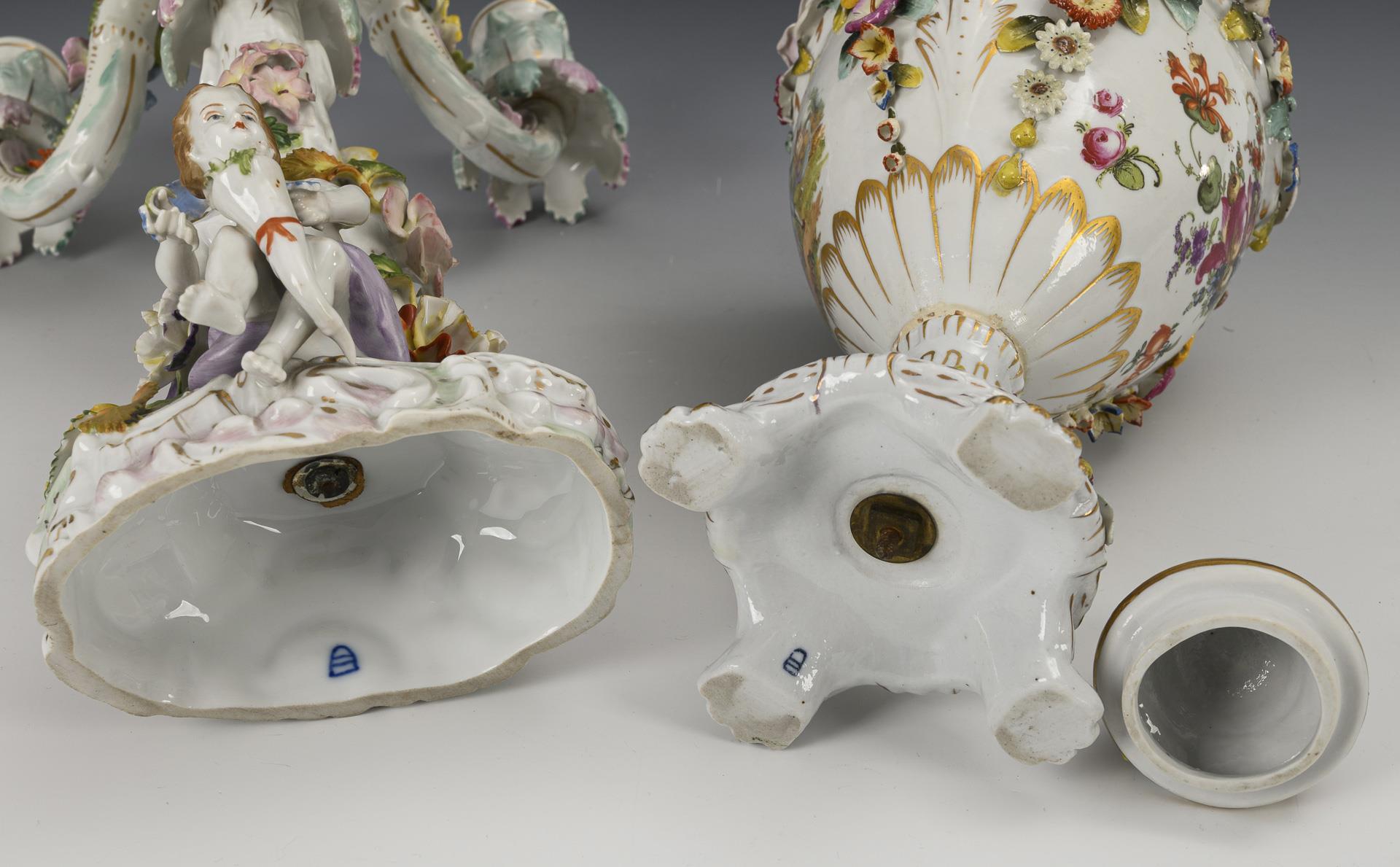 1x 5-flammiger Leuchter mit vier Leuchterarmen, Baumstammschaft sowie einem auf dem Rocaillesockel sitzenden Putto. / 1x Amphorenvase mit zwei gerollten Henkeln, Blütenknaufdeckel und Rundfuß mit vier Tatzenfüßen, schauseitig Watteau-Dekor. Bestoßungen am Belag,.