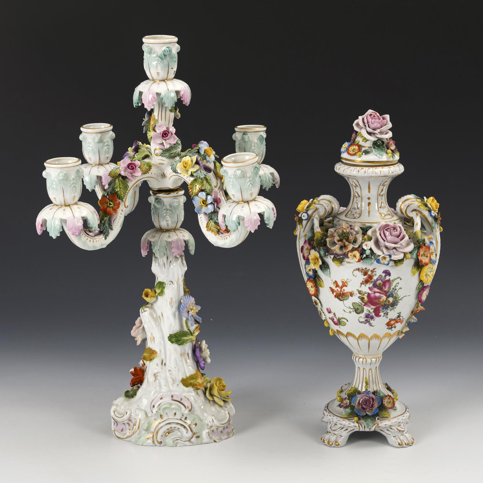 Leuchter und Deckelvase mit reichem Blütenbelag.